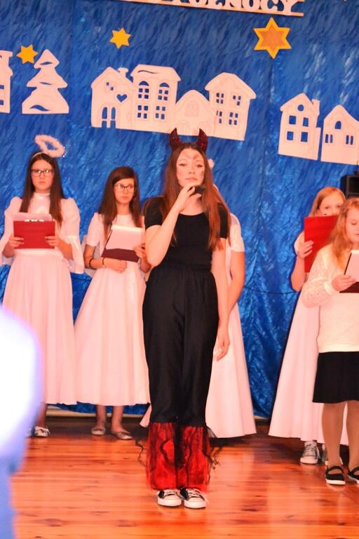 zaangażowaniem wcielili się w różne role doskonale oddając klimat wydarzeń Betlejemskiej Nocy. Nie zabrakło przebudzenia pasterzy w środku nocy i obwieszczenia im radosnej nowiny, udziału aniołów i diabłów,