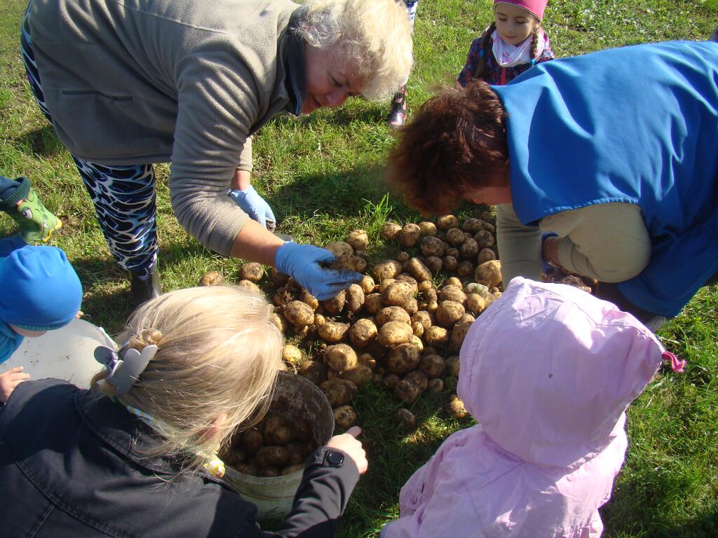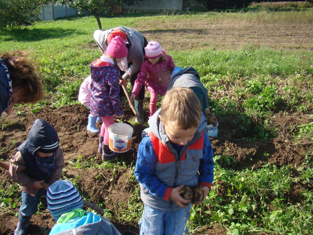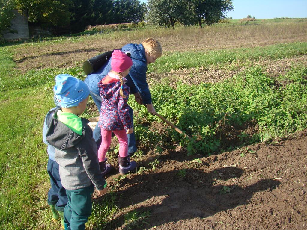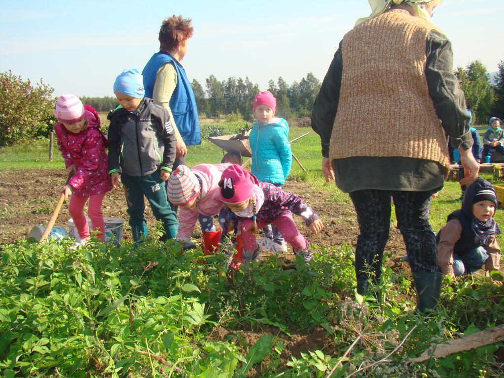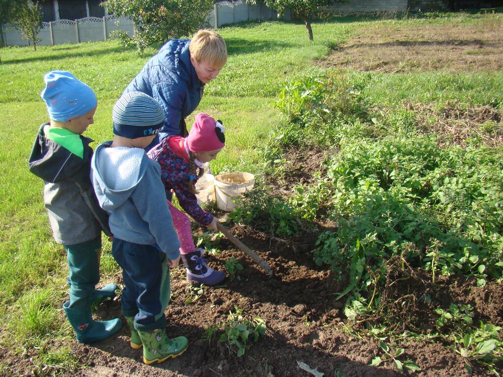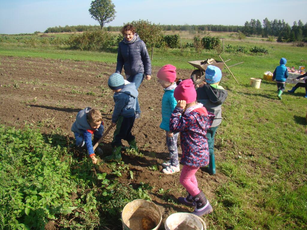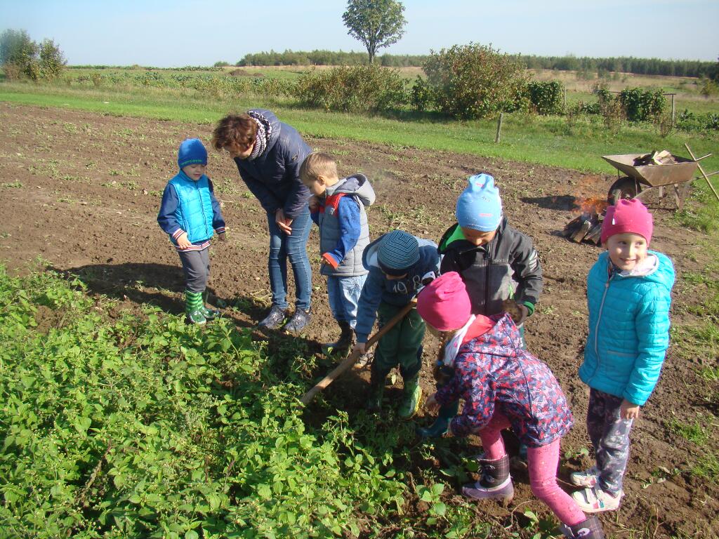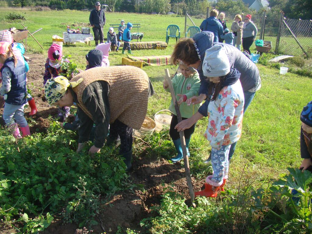 pochodzeniu, po czym z wielkim zaangażowaniem zabrały się za własnoręczne wykopywanie ziemniaków. Wielką radość sprawiło również dzieciom pieczenie kiełbasek nad ogniskiem, słodki poczęstunek przygotowany przez Panie oraz