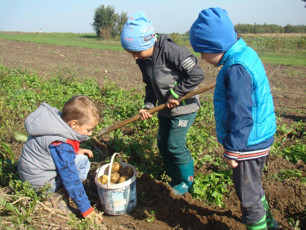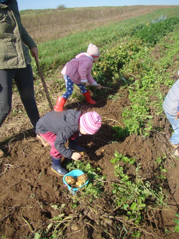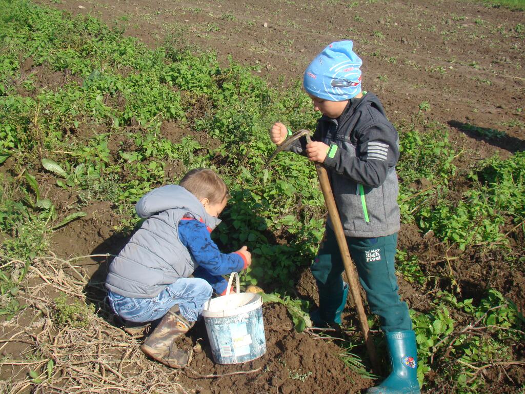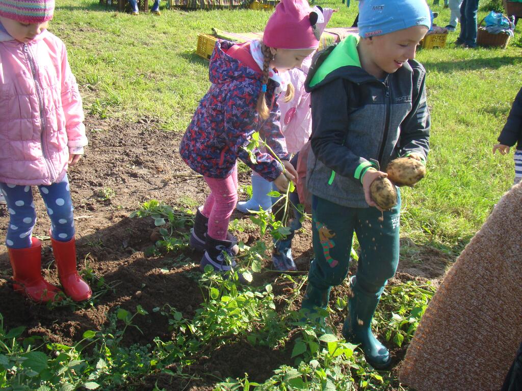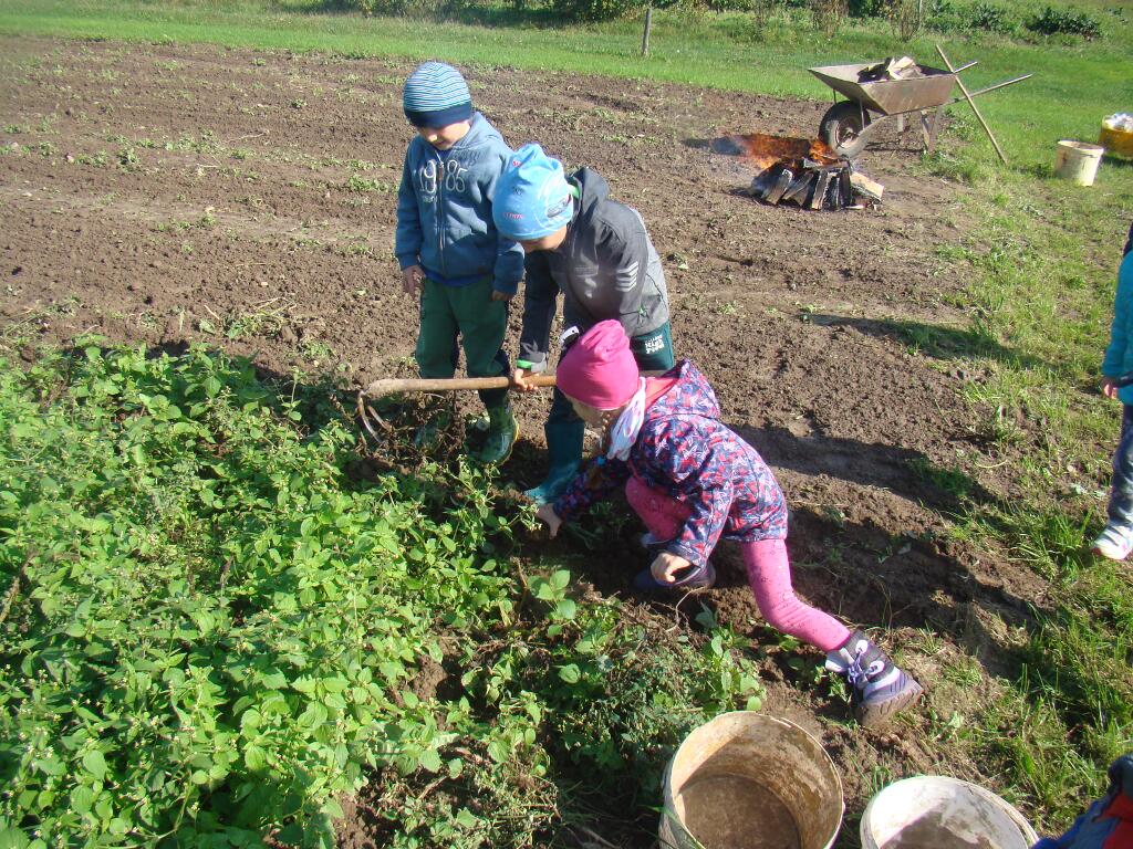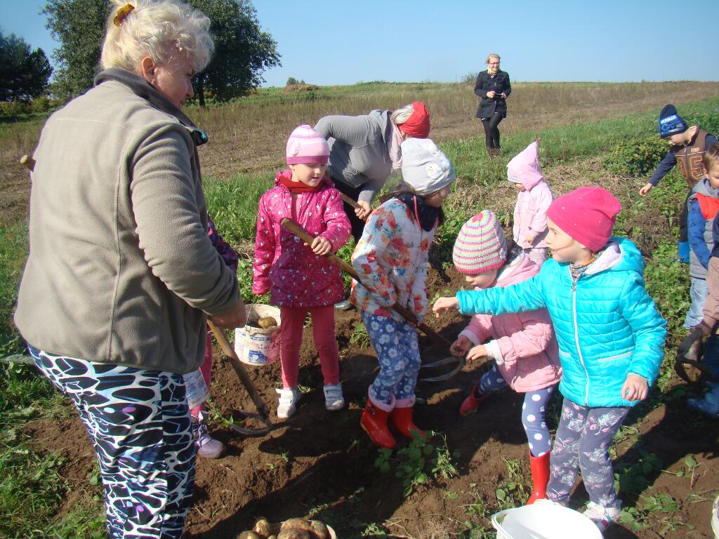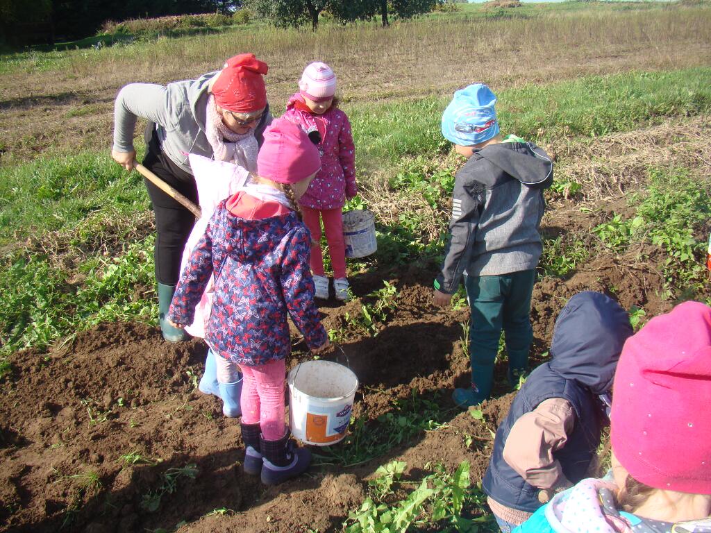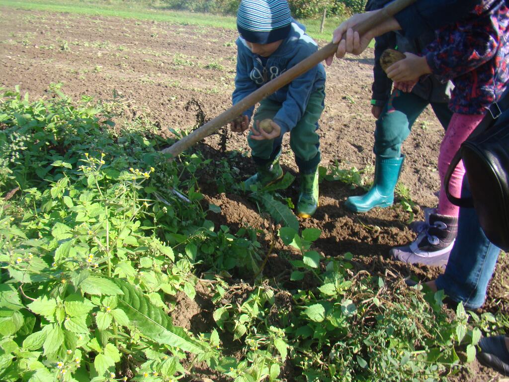 pochodzeniu, po czym z wielkim zaangażowaniem zabrały się za własnoręczne wykopywanie ziemniaków. Wielką radość sprawiło również dzieciom pieczenie kiełbasek nad ogniskiem, słodki poczęstunek przygotowany przez Panie oraz