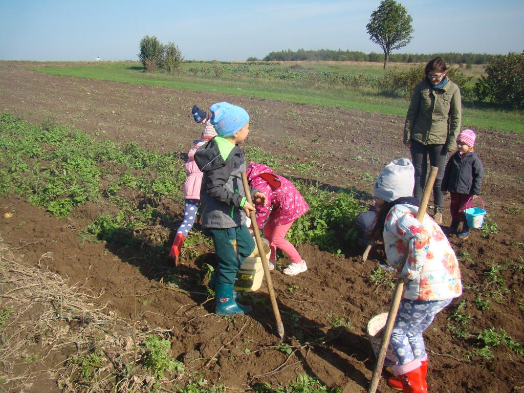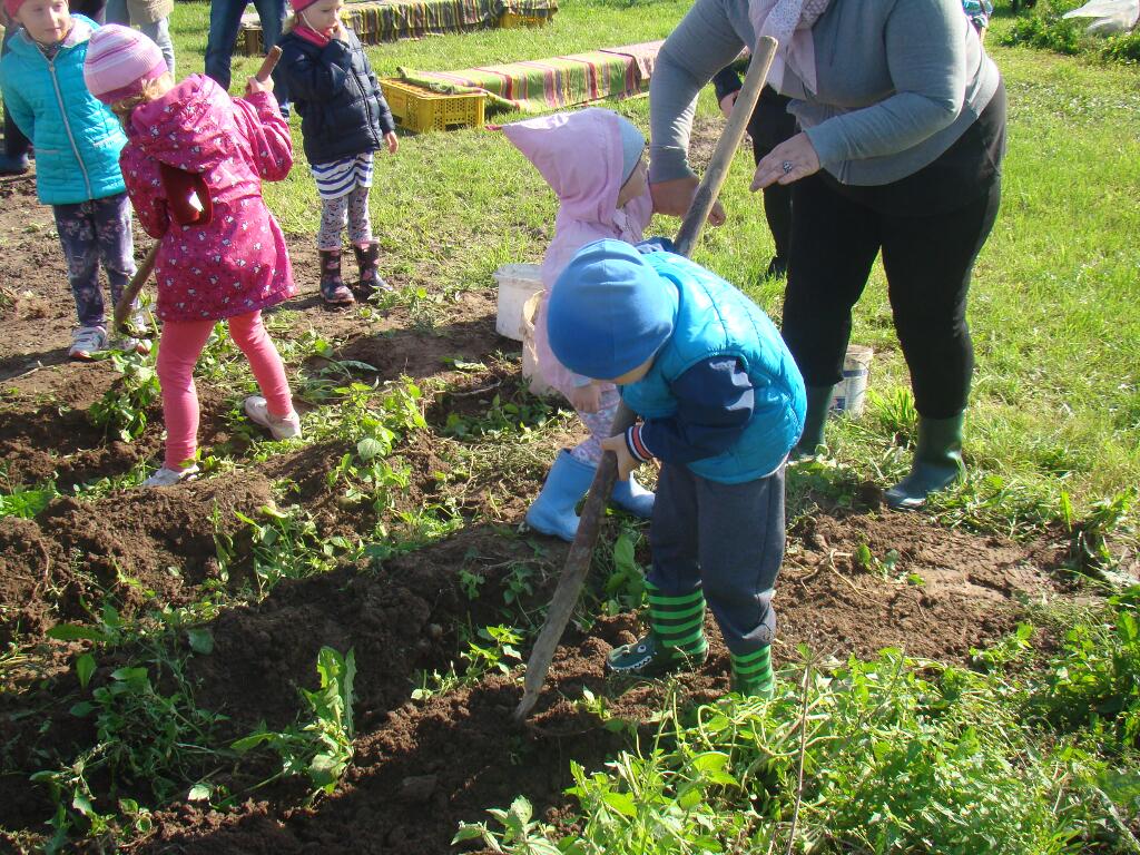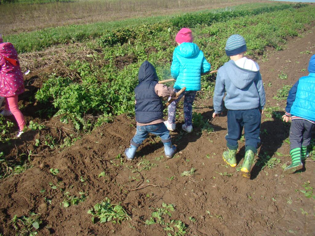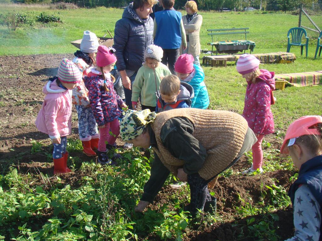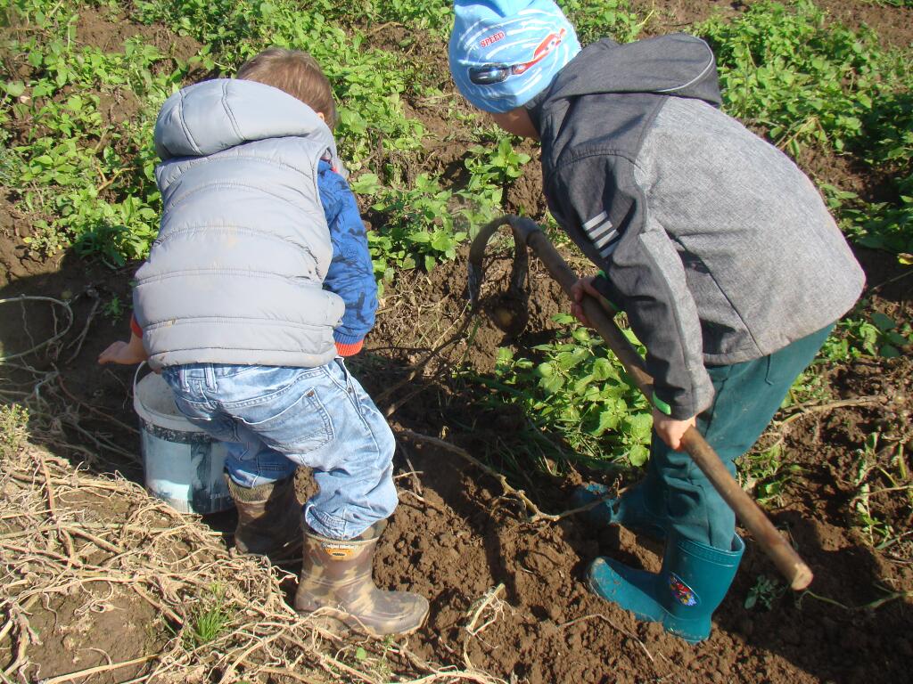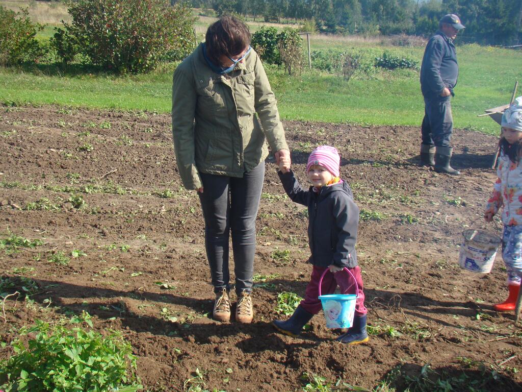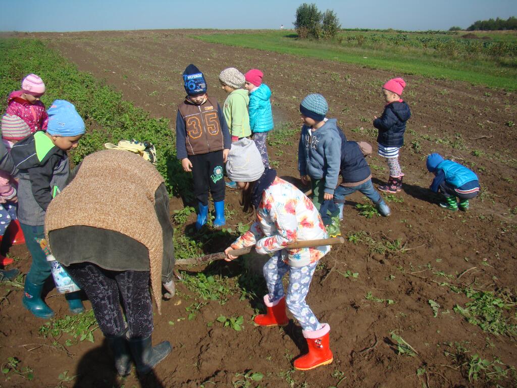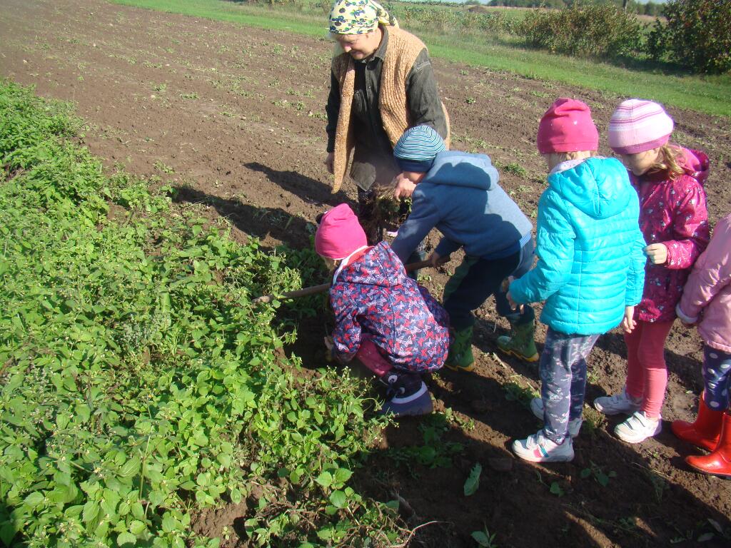 pochodzeniu, po czym z wielkim zaangażowaniem zabrały się za własnoręczne wykopywanie ziemniaków. Wielką radość sprawiło również dzieciom pieczenie kiełbasek nad ogniskiem, słodki poczęstunek przygotowany przez Panie oraz