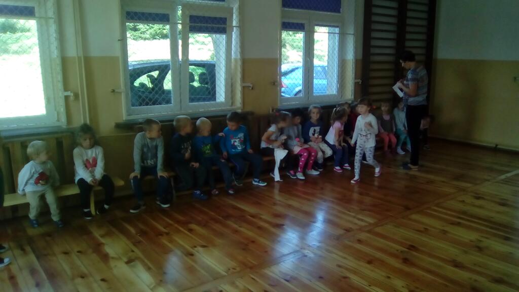 takie jak: taniec w parach, bieg z przeszkodami, bieg po ławeczce. Wszystkie dzieci bardzo gorąco dopingowały swoich kolegów biorących udział w konkursach. Nagrodą dla wszystkich dzieci był słodki poczęstunek. Na zakończenie