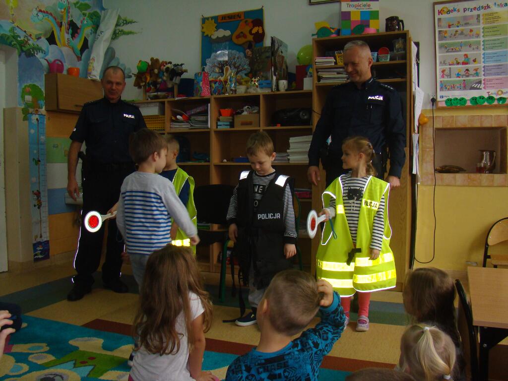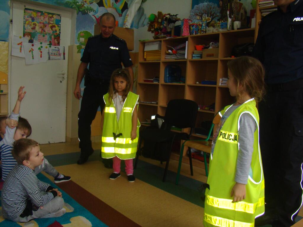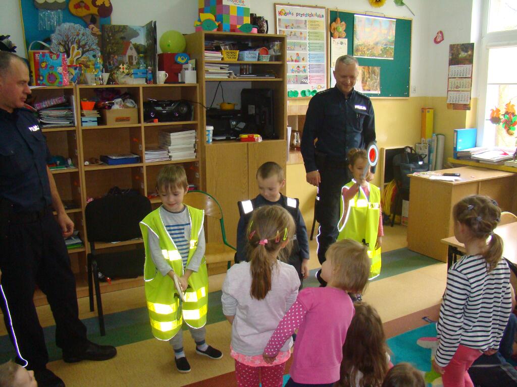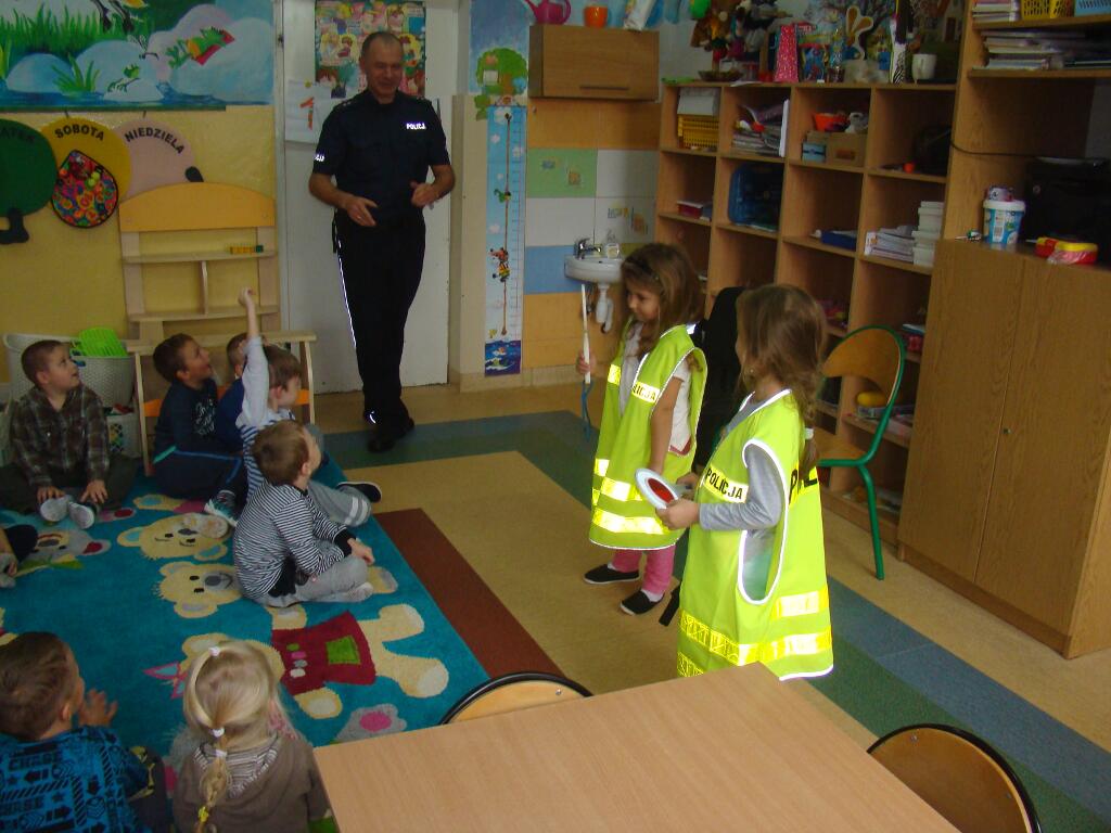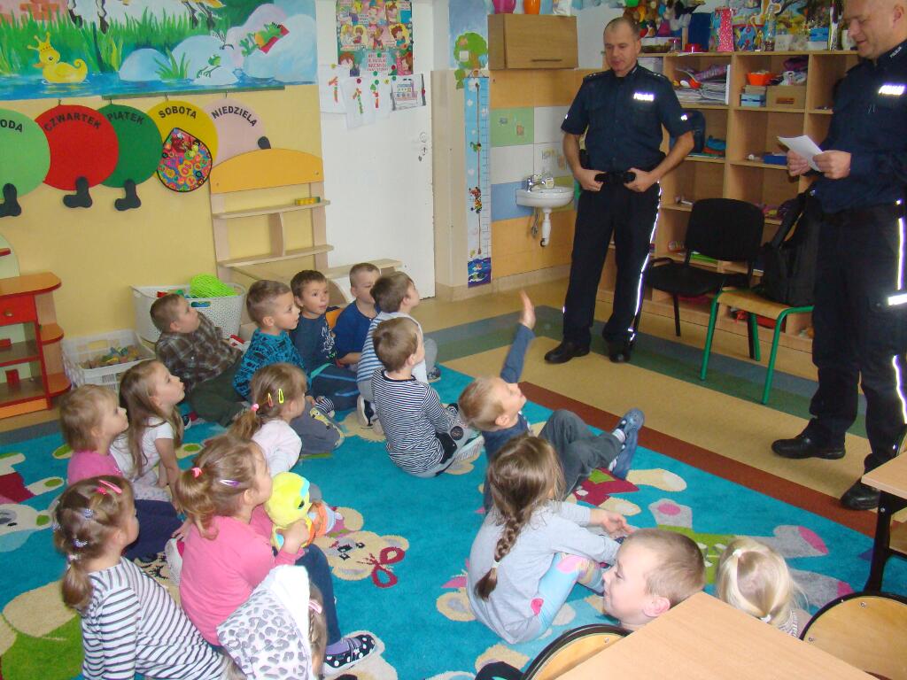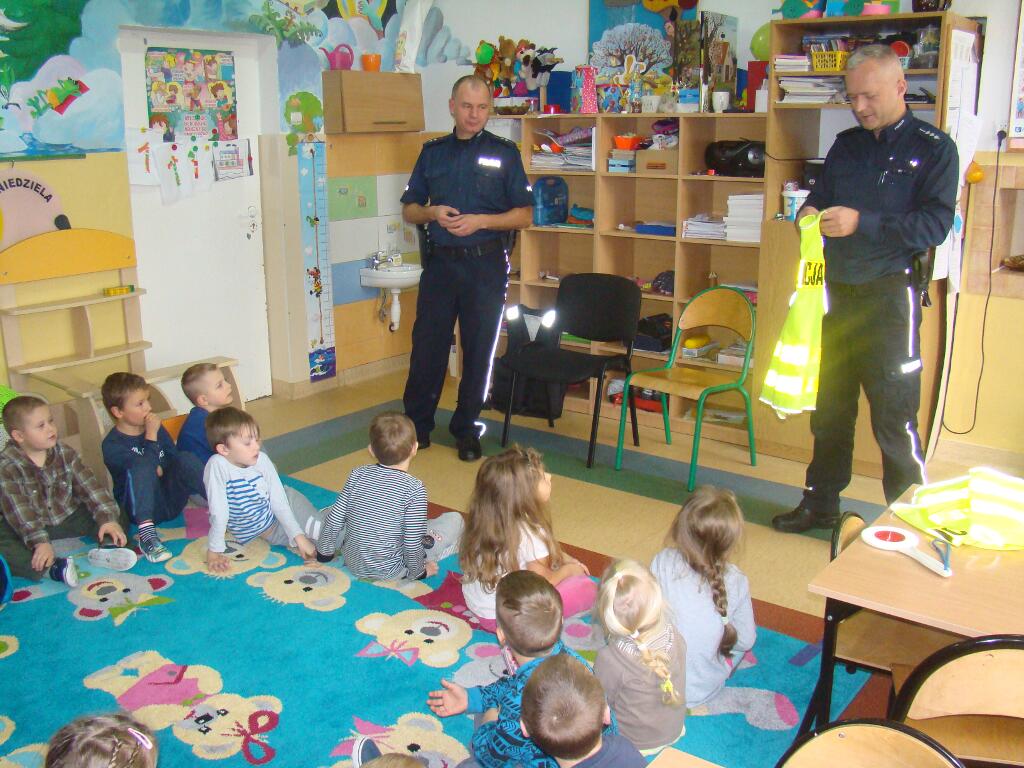 dotyczących bezpieczeństwa dzieci w przedszkolu i w domu. Panowie policjanci, w formie praktycznej, przypomnieli podstawowe zasady zachowania się podczas przechodzenia przez jezdnię. Następnie wytłumaczyli jak należy