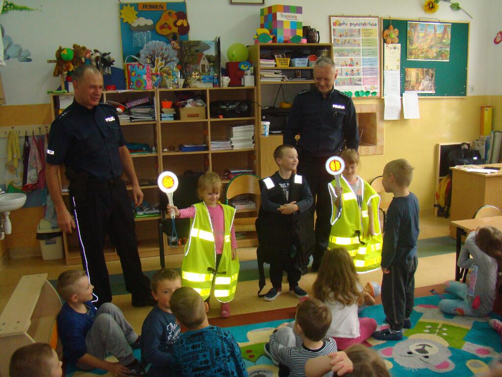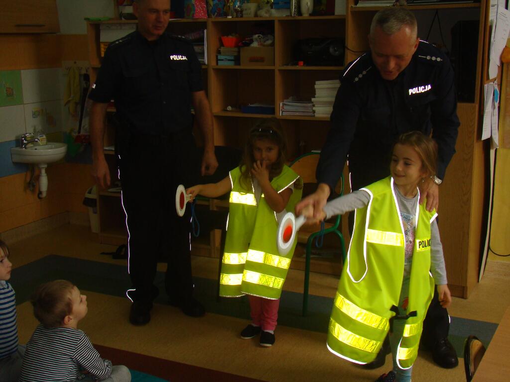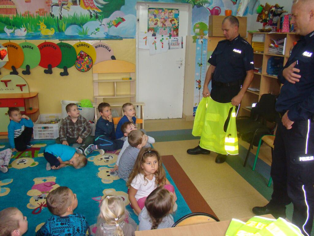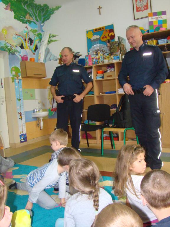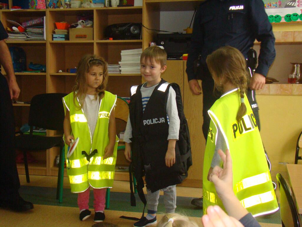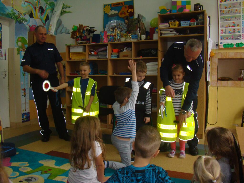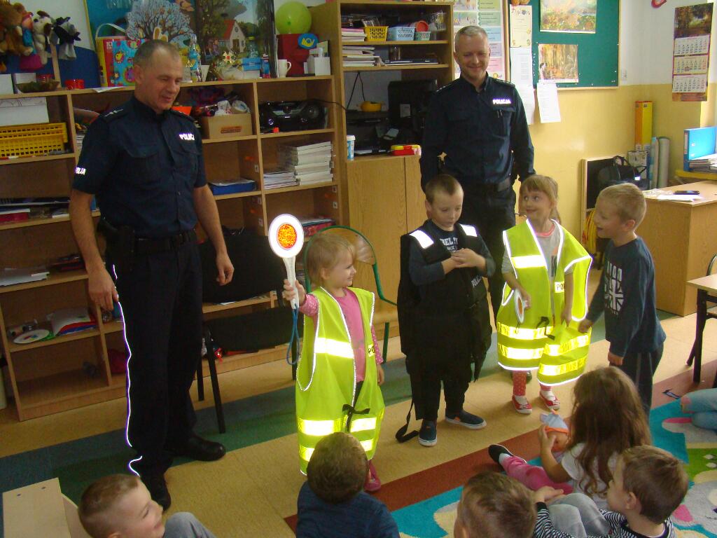 dotyczących bezpieczeństwa dzieci w przedszkolu i w domu. Panowie policjanci, w formie praktycznej, przypomnieli podstawowe zasady zachowania się podczas przechodzenia przez jezdnię. Następnie wytłumaczyli jak należy