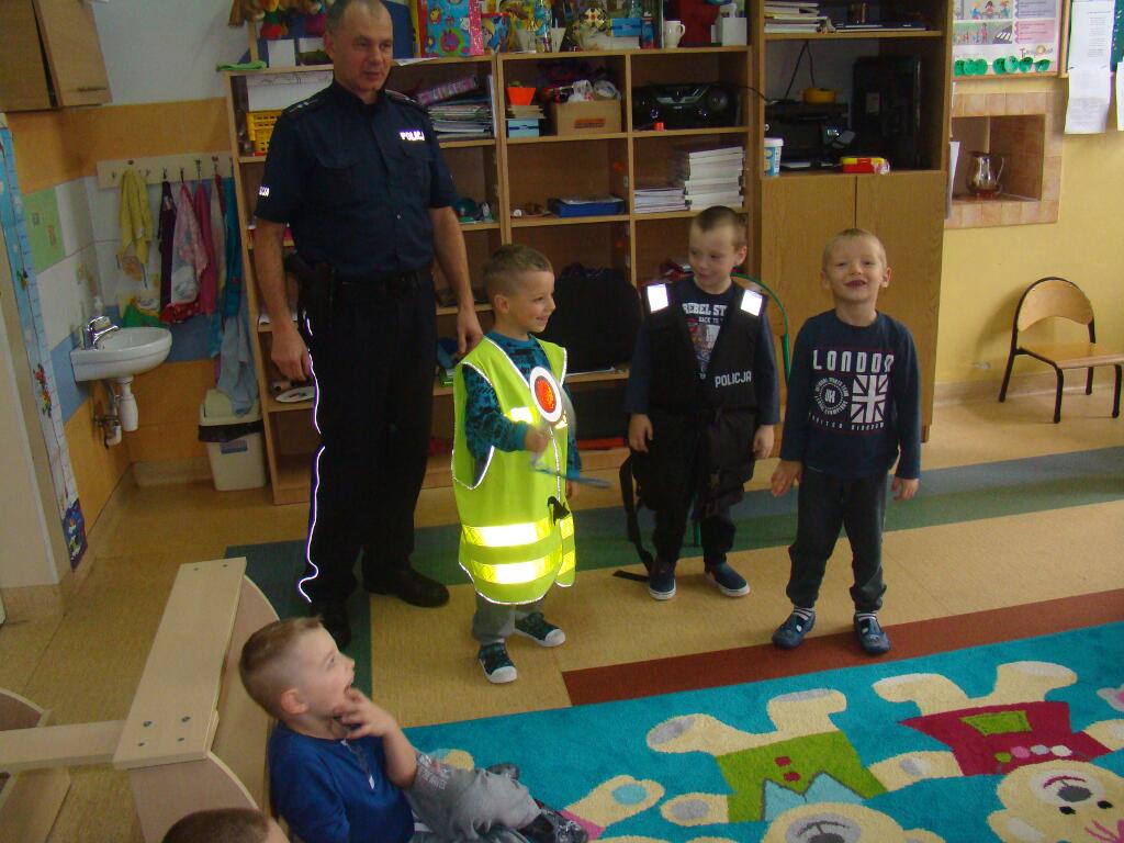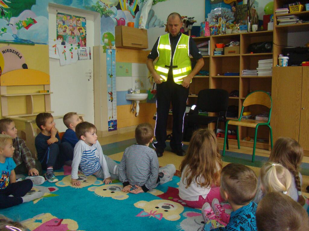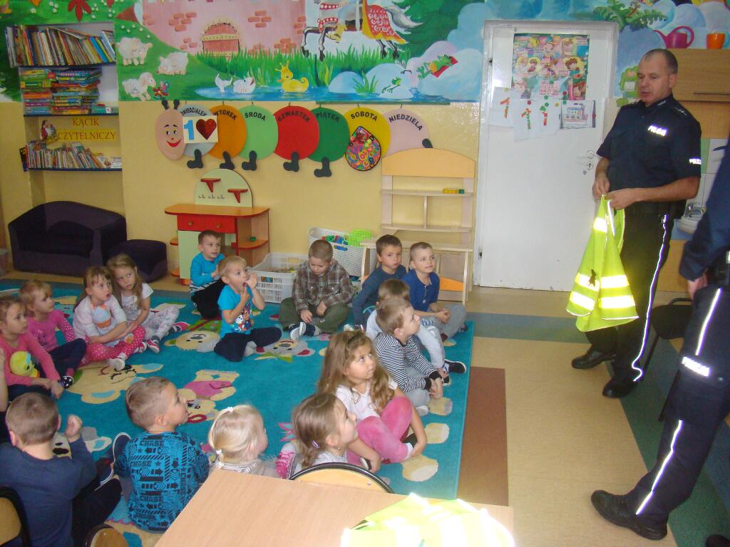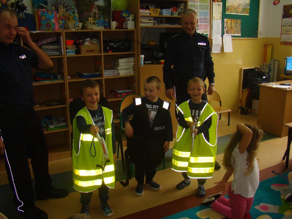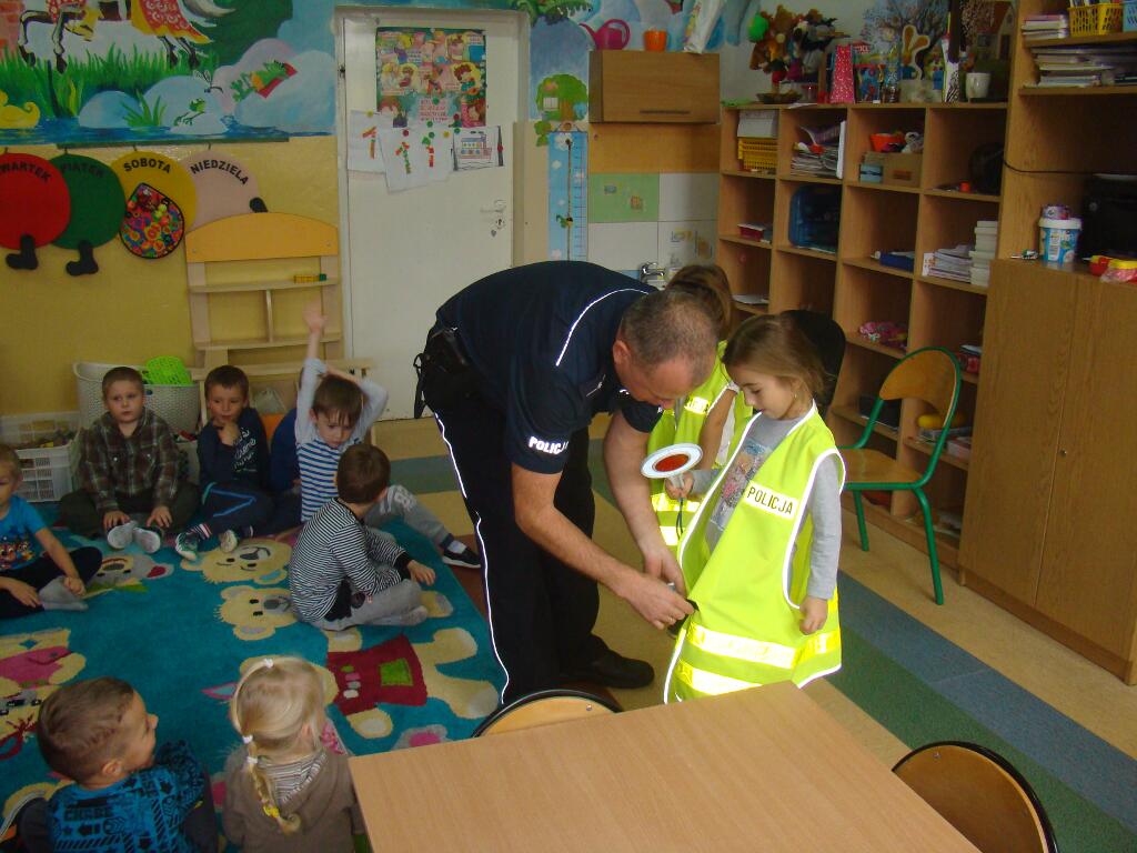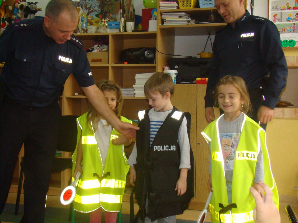 dotyczących bezpieczeństwa dzieci w przedszkolu i w domu. Panowie policjanci, w formie praktycznej, przypomnieli podstawowe zasady zachowania się podczas przechodzenia przez jezdnię. Następnie wytłumaczyli jak należy