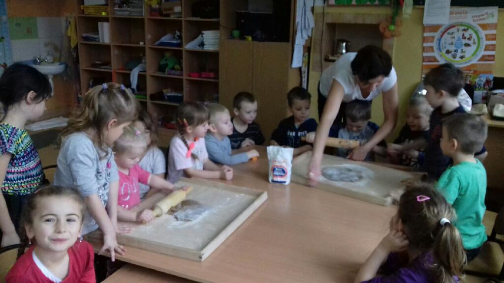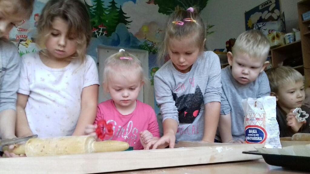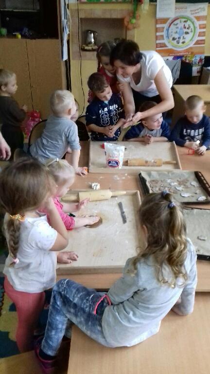 do pracy – wałkowały ciasto, wykrawały ciasteczka. Efektem naszej pracy były pełne blaszki pierniczków, które zanieśliśmy do kuchni. Tu pod czujnym okiem naszej pani kucharki pierniki nabierały koloru piekąc się w