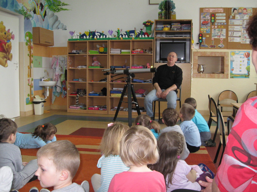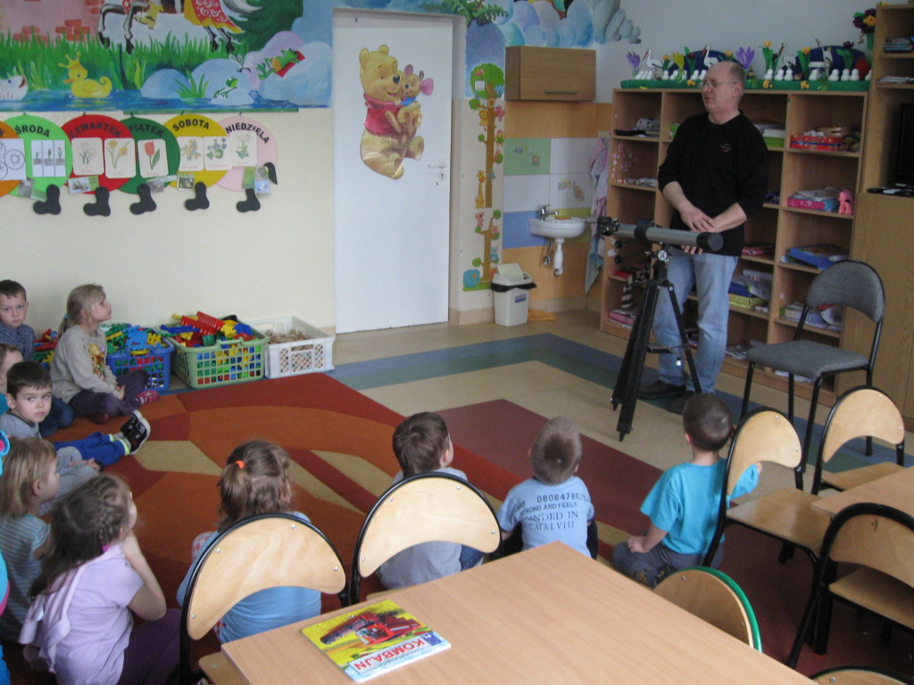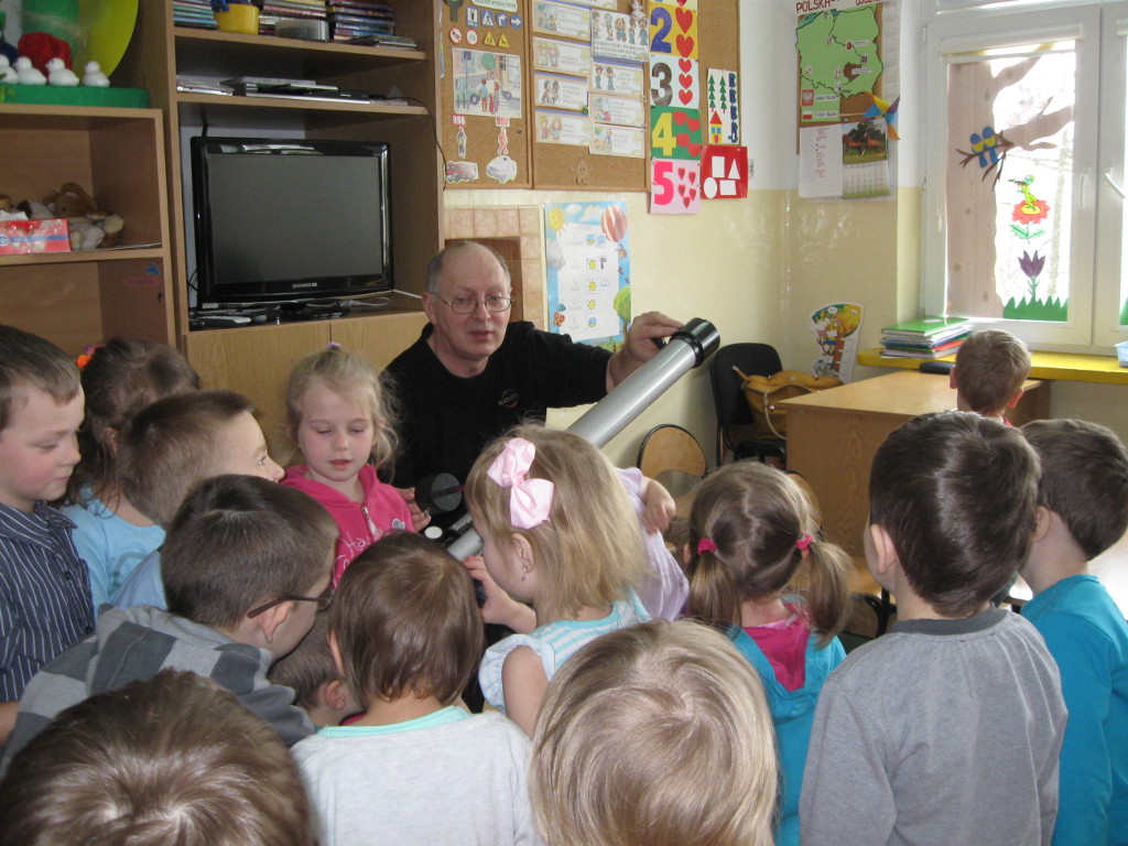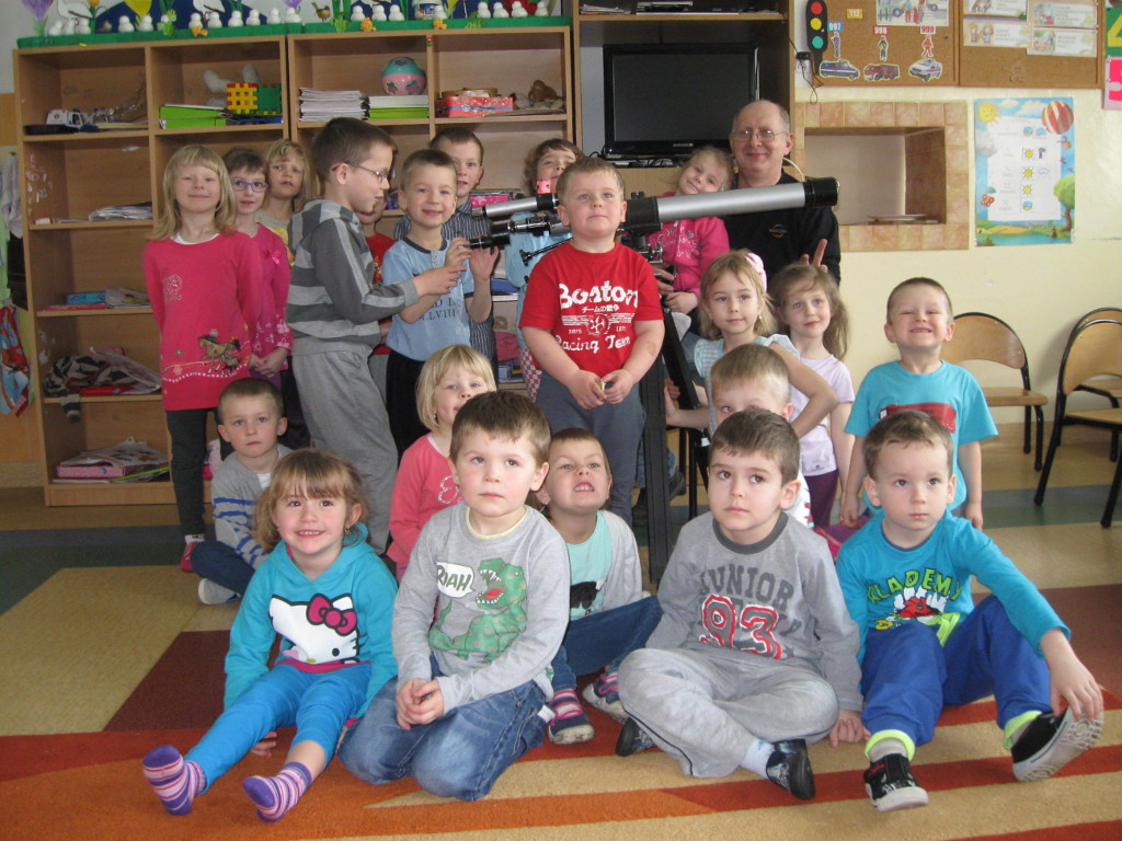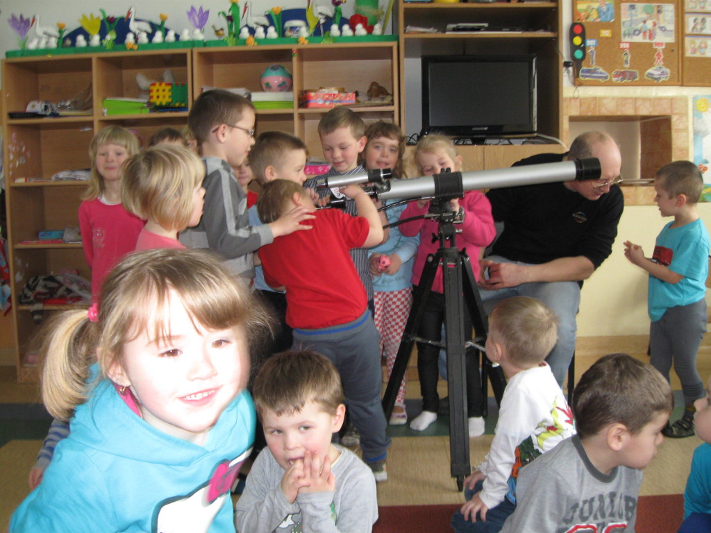 W miniony czwartek 20 marca w przedszkolu odbyło się spotkanie z tatą Zuzi. Podczas spotkania Pan Piotr opowiedział przedszkolakom o astronomii. Opowieść zaczął od Układu Słonecznego, czyli od Słońca aż do planet. Dzieci zaoferowane ciekawymi opowieściami czynnie brały udział w niektórych z nich. Każdy chciał choć przez chwilę popatrzeć przez lunetę.
