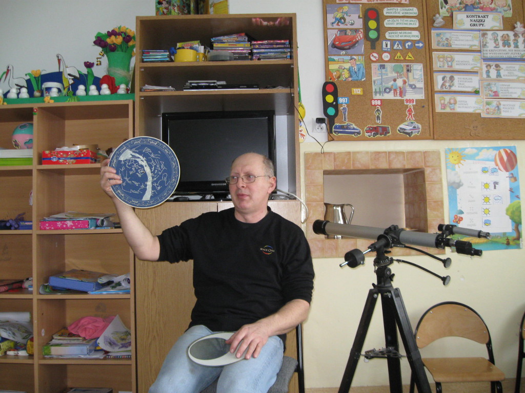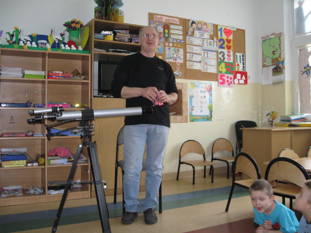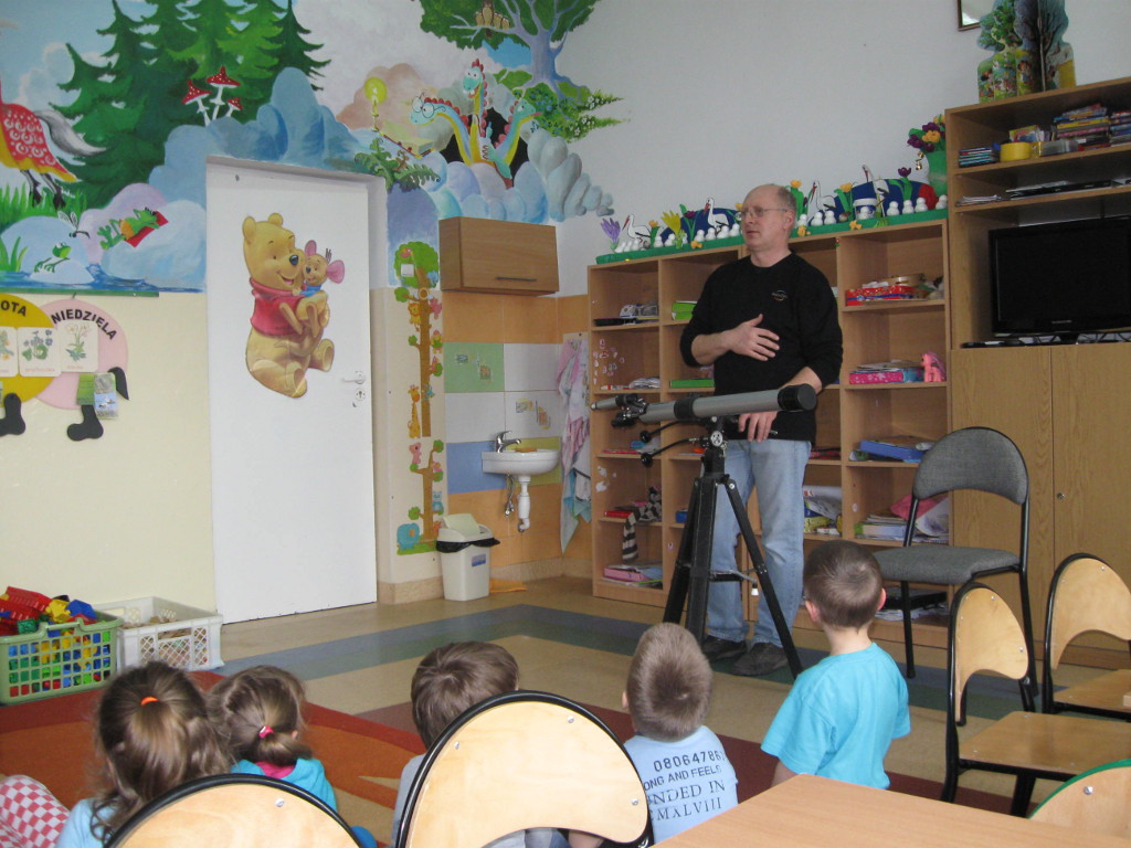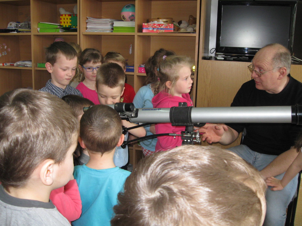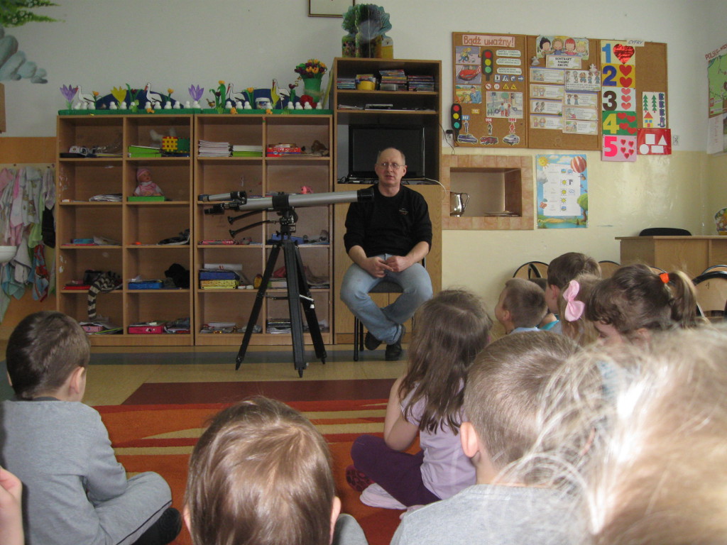 W miniony czwartek 20 marca w przedszkolu odbyło się spotkanie z tatą Zuzi. Podczas spotkania Pan Piotr opowiedział przedszkolakom o astronomii. Opowieść zaczął od Układu Słonecznego, czyli od Słońca aż do planet. Dzieci zaoferowane ciekawymi opowieściami czynnie brały udział w niektórych z nich. Każdy chciał choć przez chwilę popatrzeć przez lunetę.