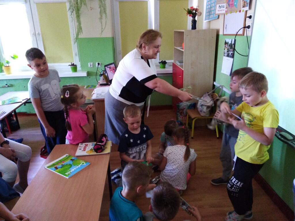i pobawić się ze starszymi kolegami oraz zasiąść w szkolnej ławce. Bardzo miła pani nauczycielka - p. Bożena Kwaśniewska, przyszła wychowawczyni klasy I, na zakończenie obdarowała każde dziecko małym upominkiem.