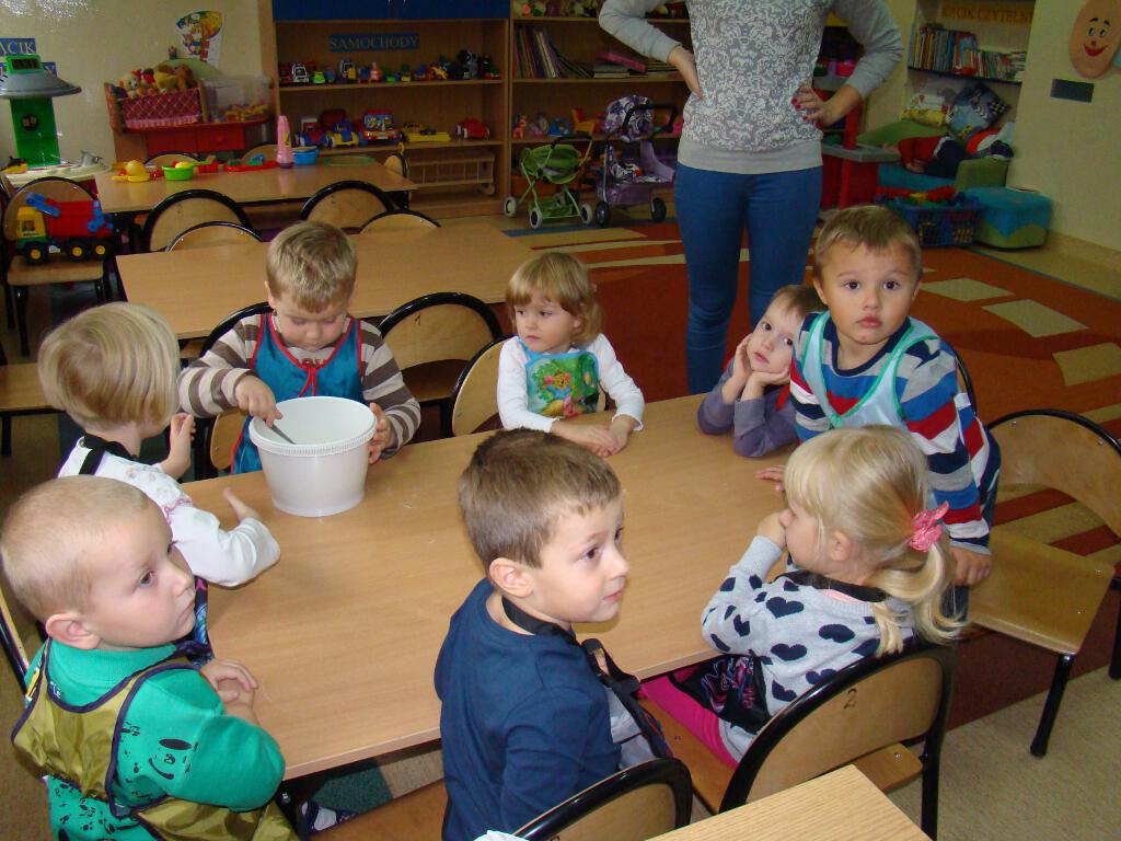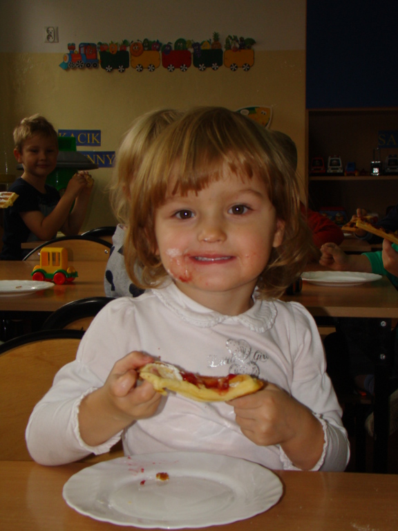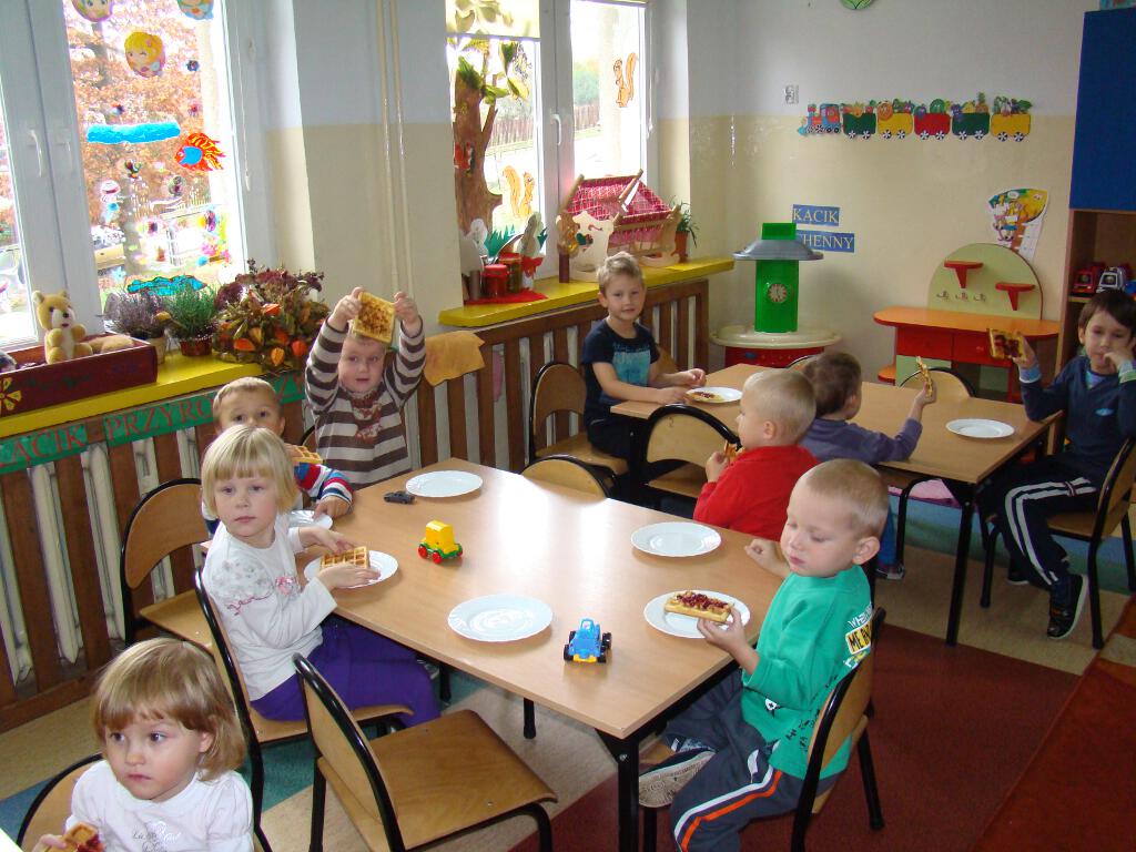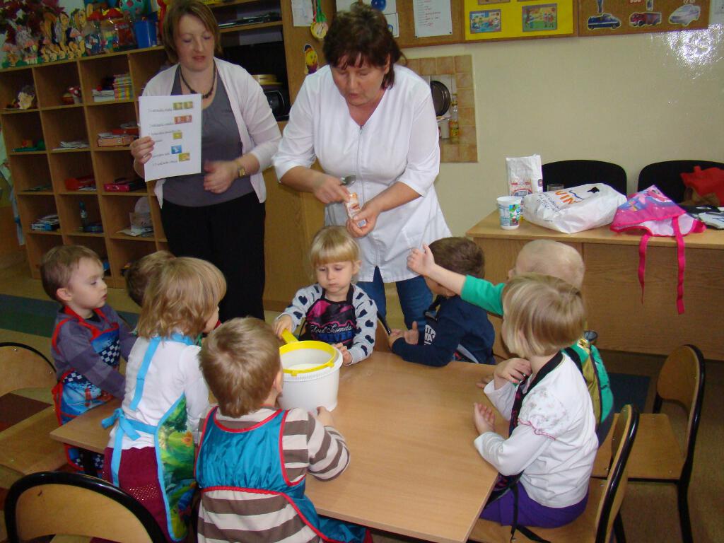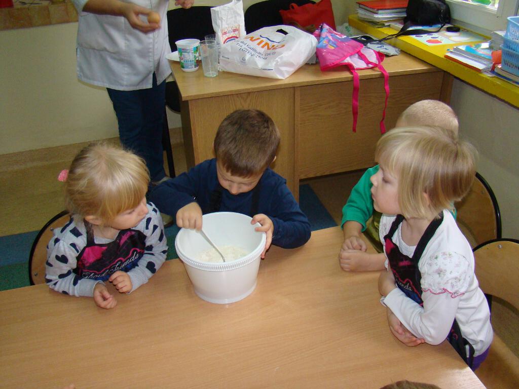 Dzieci miały możliwość przygotowania pysznych gofrów. Zajęcia kulinarne są również doskonałą zabawą, a potrawy własnoręcznie zrobione smakują wyśmienicie. Żadne dziecko nie odmówiło skosztowania tego co wspólnie zostało przygotowane. Gdy nadeszła upragniona chwila dzieci usiadły do stolików i zajadały się goframi z dżemem i cukrem pudrem. Zapach pieczonych gofrów był w całej sali.