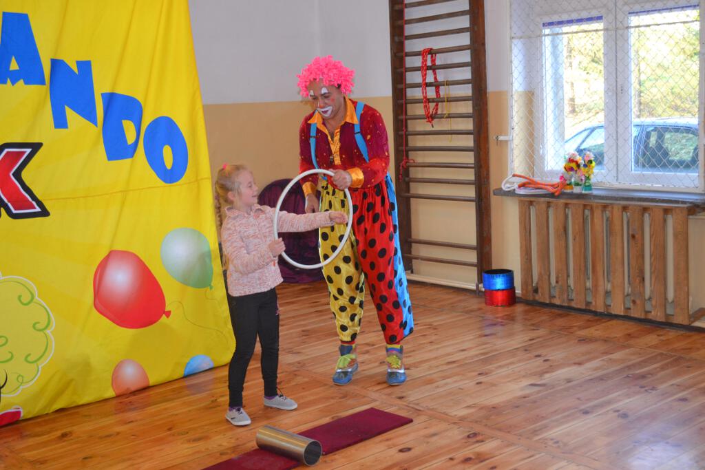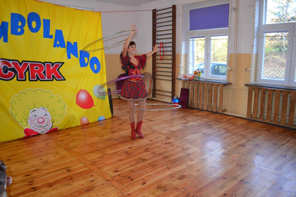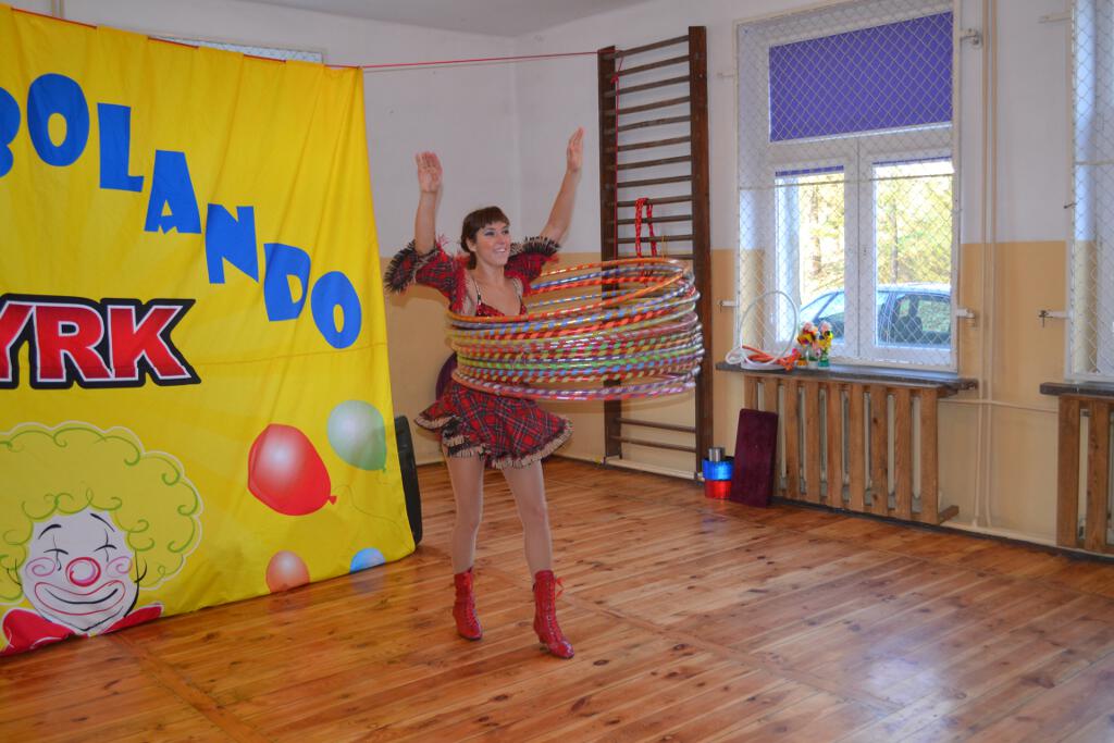 Oglądaliśmy m.in. pokaz jednoczesnego poruszanie wieloma kołami hula- hop, żonglerkę maczugami, piłkami. Nie zabrakło również „czarodzieja- iluzjonisty” i zabawnego klauna, który z wielką wprawą rozśmieszał przedszkolaków.