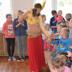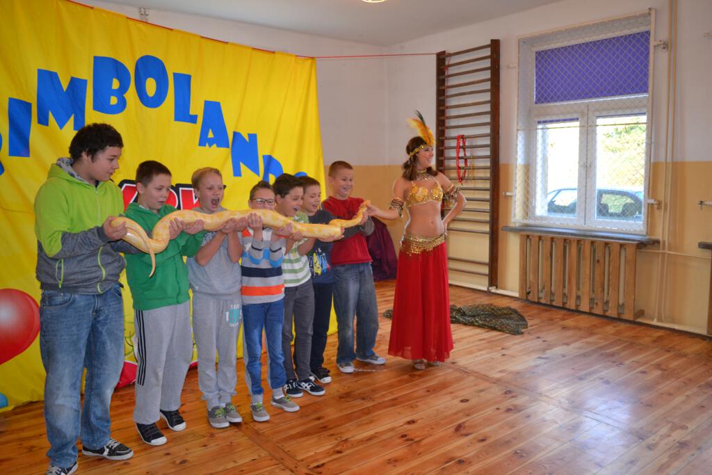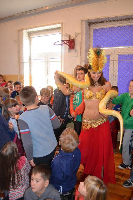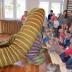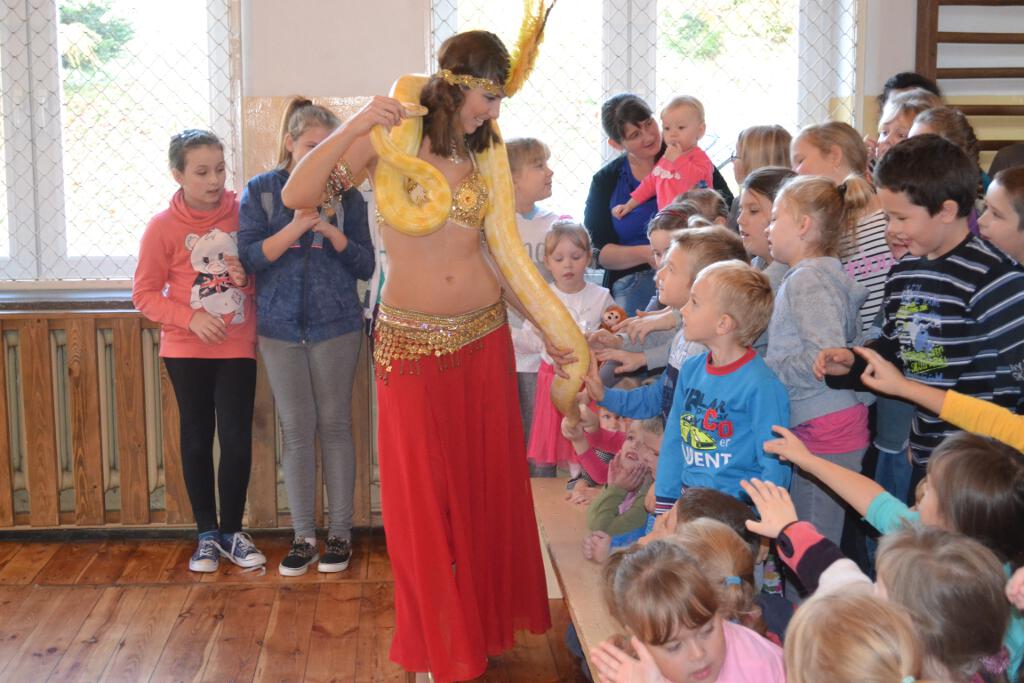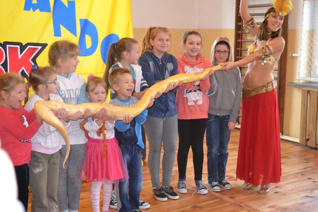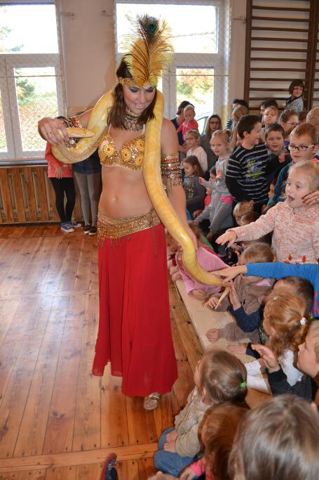Na koniec przedstawienia dzieci podziwiały ogromnego biało-żółtego pytona królewskiego pełniącego rolę to „paska do kostiumu”, to „egzotycznego szala”.