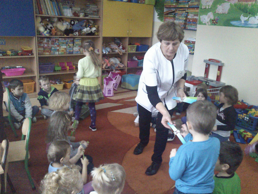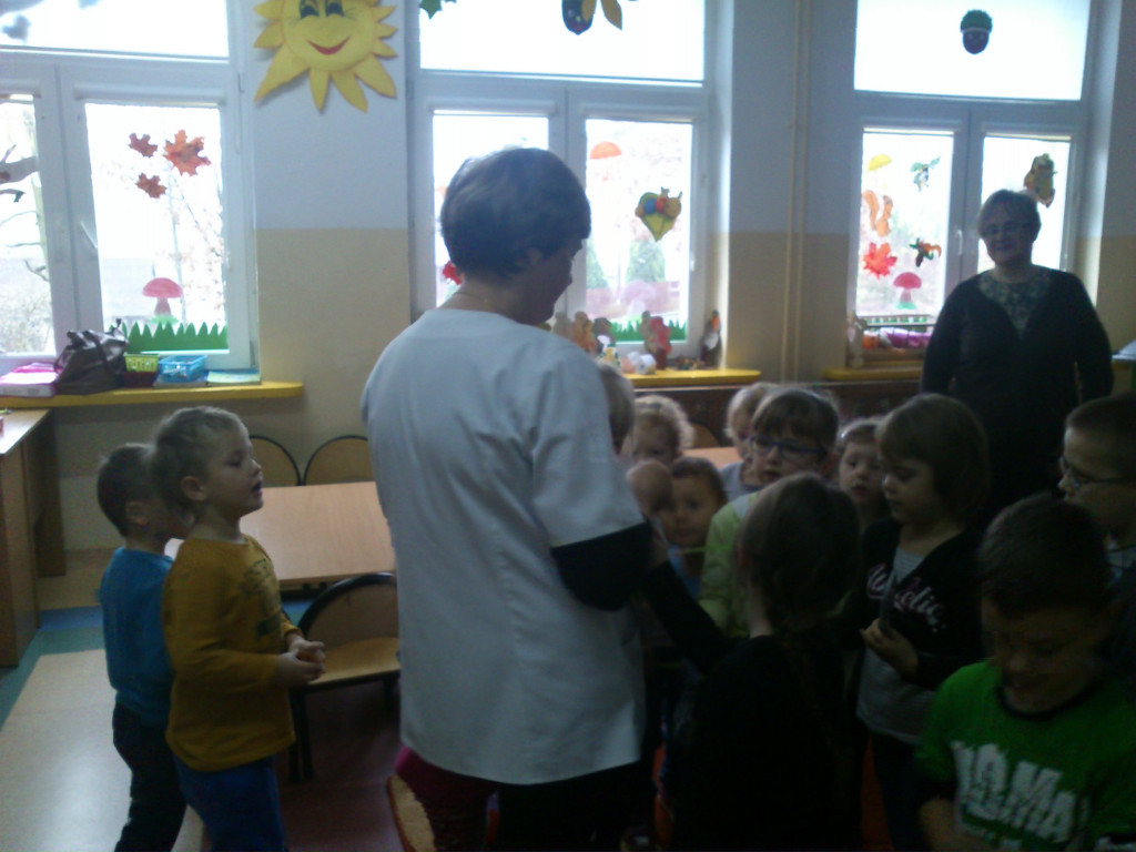 W piątek 15 listopada dzieci z naszego przedszkola odwiedziła pani pielęgniarka - Janina Obara z Niepublicznego Zespołu Opieki Zdrowotnej w Łącznej. Celem spotkania było uświadomienie dzieciom konieczności dbania o własne zdrowie, aby do późnych lat swojego życia mieć dobre samopoczucie i siły witalne do działania. Podczas spotkania dzieci dowiedziały się jak należy zdrowo się odżywiać, gdzie mieszkają witaminki oraz wieli innych ważnych informacji. Uświadomiły sobie również, że nawet zwykłe wycieranie noska, jest bardzo ważne, gdyż nieumiejętne prowadzi do wielu chorób. Dzieci miały mnóstwo pytań do pani pielęgniarki, na które pani z radością odpowiedziała.
