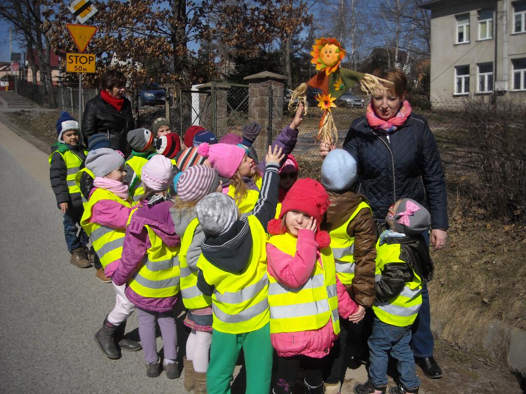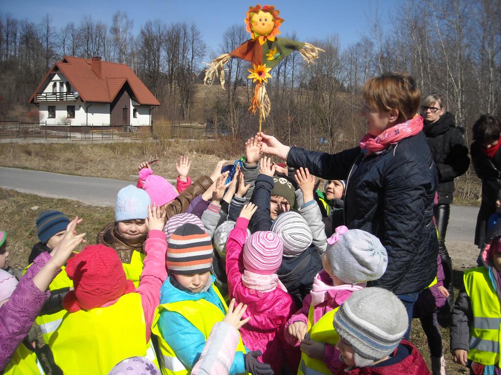 W dniu 23.03.2015r. dzieci z naszego przedszkola wzięły udział w tradycyjnym obrzędzie „pożegnania zimy - powitania wiosny”. Przygotowania do tej uroczystości przedszkolnej odbywały się już wcześniej poprzez naukę piosenek, wierszyków i rymowanek. O godzinie 11.30 wszystkie przedszkolaki zebrały się przed przedszkolem by wyruszyć barwnym korowodem. Wszystkich ogarnęła spontaniczna radość. Wiosenne słońce przygrzewało i oświetlało roześmiane twarze uczestników korowodu. Dzieci pożegnały Marzannę - zimową pannę, a gromkimi brawami powitały wiosnę. Podczas powrotu do przedszkola wszystkie dzieci postanowiły szukać dowodów jej przybycia.