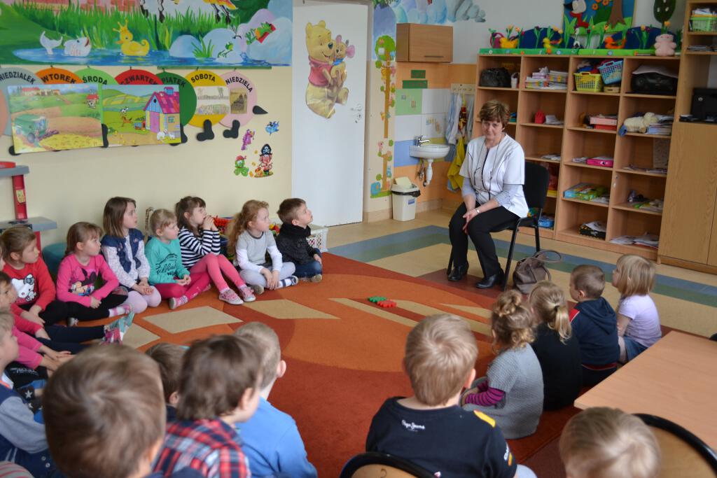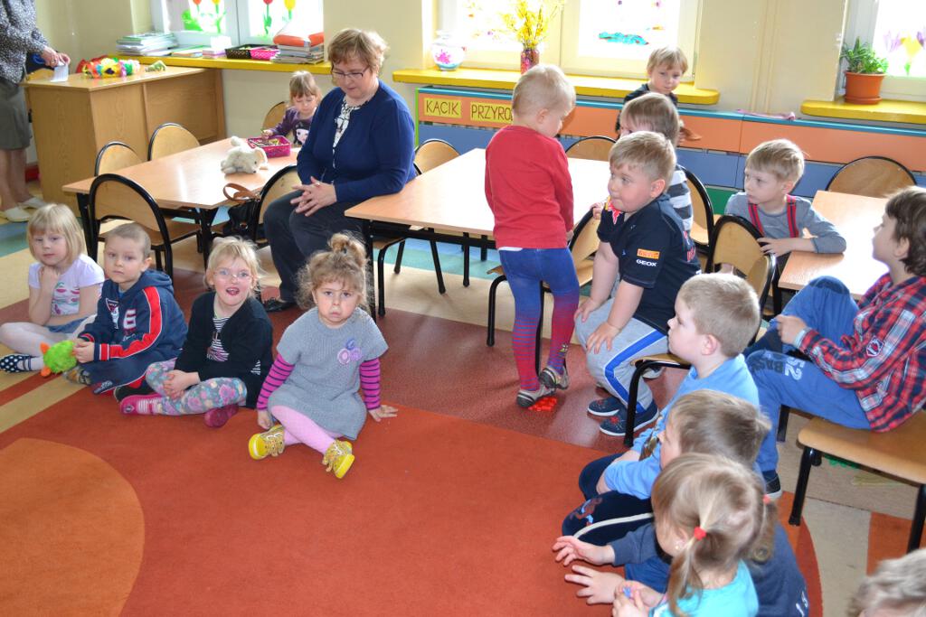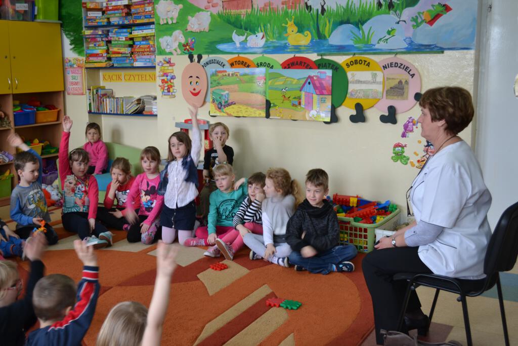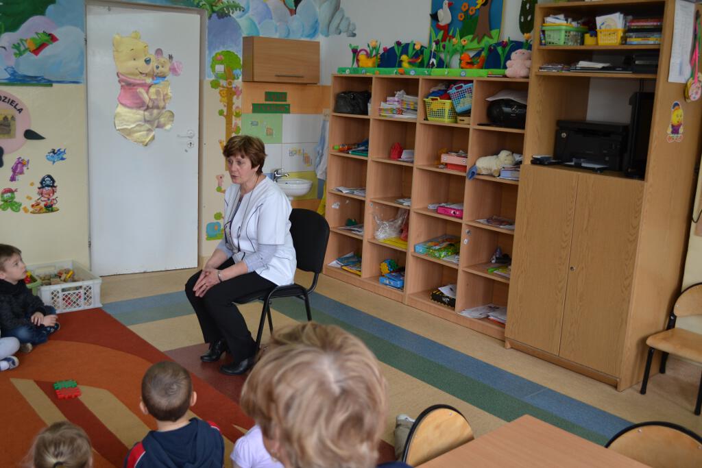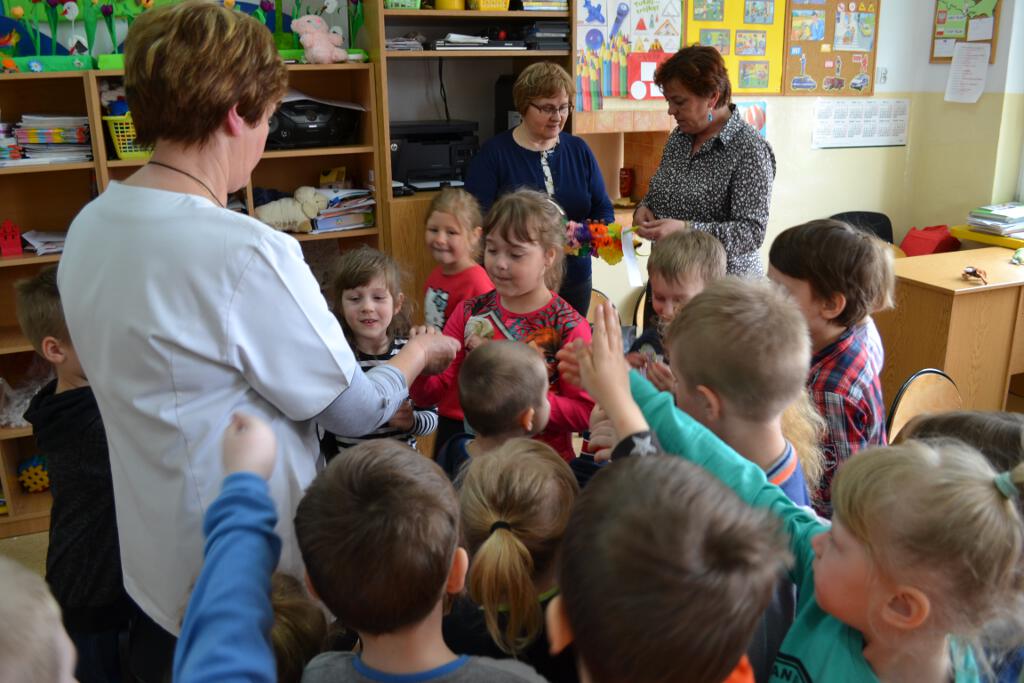 W maju do naszego przedszkola zawitała - pani Janina Obara, która na co dzień pracuje jako pielęgniarka w NZOZ w Łącznej. Podczas spotkania dzieci miały okazję dowiedzieć się więcej o trudnym zawodzie pielęgniarki, pokonać lęk przed zabiegami medycznymi, a przede wszystkim wzbogacić i utrwalić swoje wiadomości na temat sposobów dbania o zdrowie. Pani pielęgniarka przypomniała dzieciom, jak należy ubierać się odpowiednio do pogody, jak właściwie się odżywiać i jak zachować zasady higieny i zdrowego stylu życia. Dzieci udzielając odpowiedzi na pytania gościa wykazały się bardzo dużą wiedzą na temat zdrowia i czystości. Nasz gość przygotował dla przedszkolaków prezenty naklejki - dzielnego pacjenta. Wizyta pani pielęgniarki zakończyła się pamiątkowym zdjęciem.