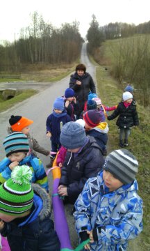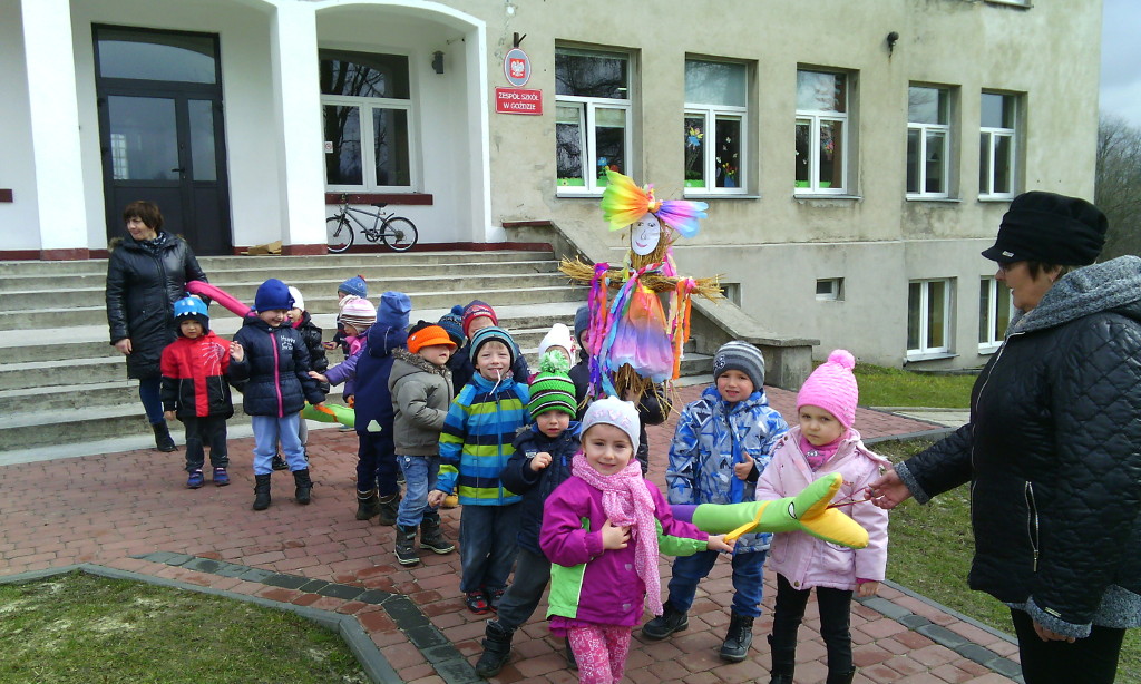 Dzieci zaangażowaniem wykonały Marzannę - symbol zimy i wesołym, barwnym korowodem przeszły nad pobliską rzeczkę, by powitać WIOSNĘ. Aby tradycji stało się zadość po przemarszu Marzanna została uroczyście pożegnana - spalona przy śpiewie wiosennych piosenek .Do przedszkola wróciliśmy z GAIKIEM, symbolem wiosny. Pa, pa zimo!