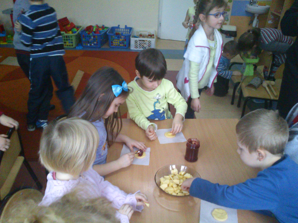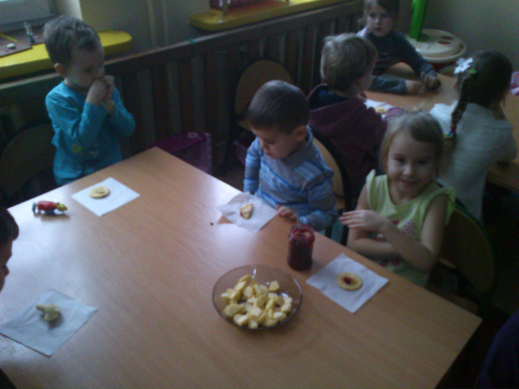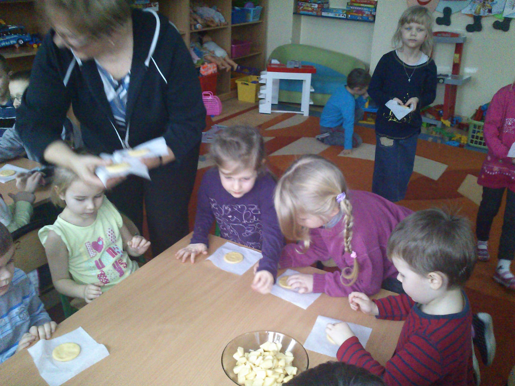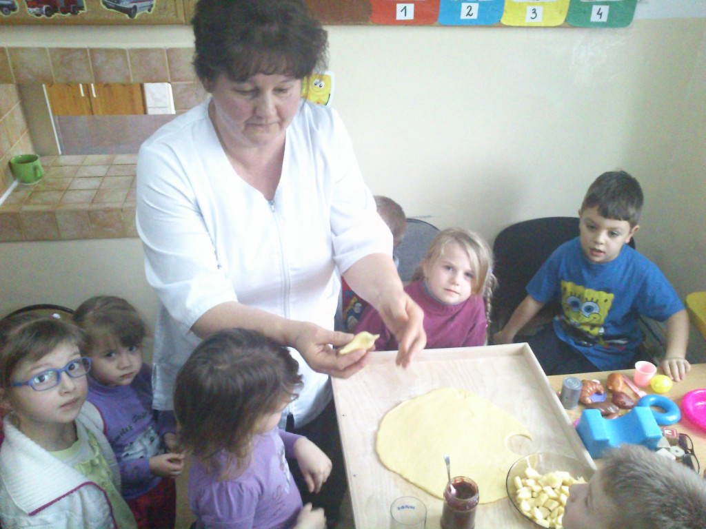 Dzieci dowiedziały się też, jakie przedmioty są potrzebne kucharce do jej pracy. Na koniec wspólnie z Panią kucharką dzieci robiły ciasteczka z jabłkiem.