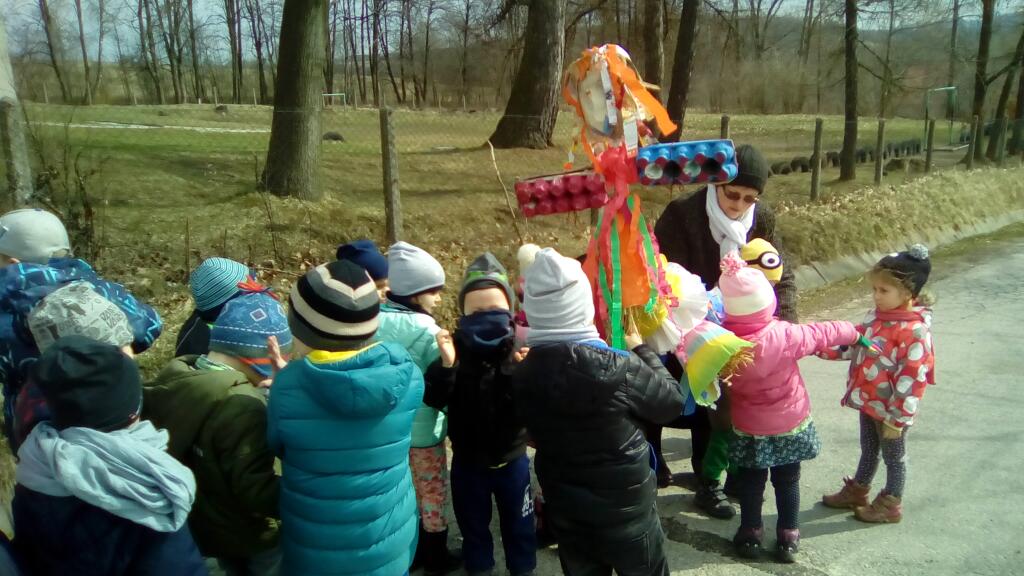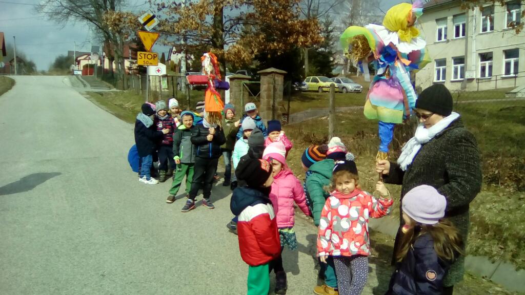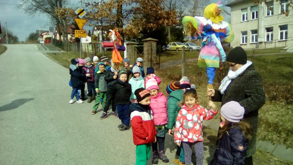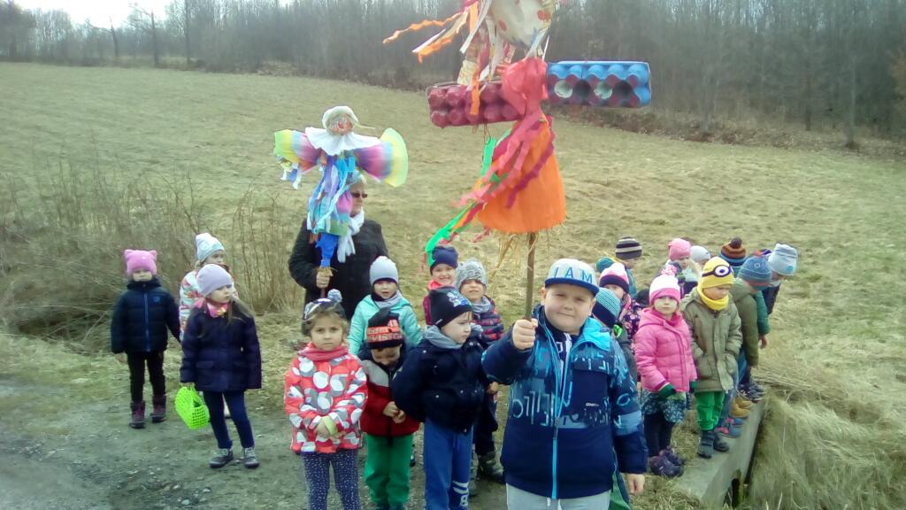 w rytm piosenek bawiąc się wesoło z uczniami klasy 6. Przemaszerowały też z kukłą Marzanną nad pobliską rzeczkę, by żegnając zimę utopić ją i przywitać Panią Wiosnę.