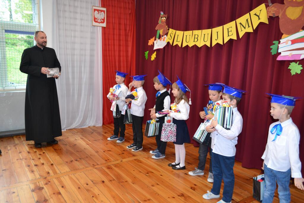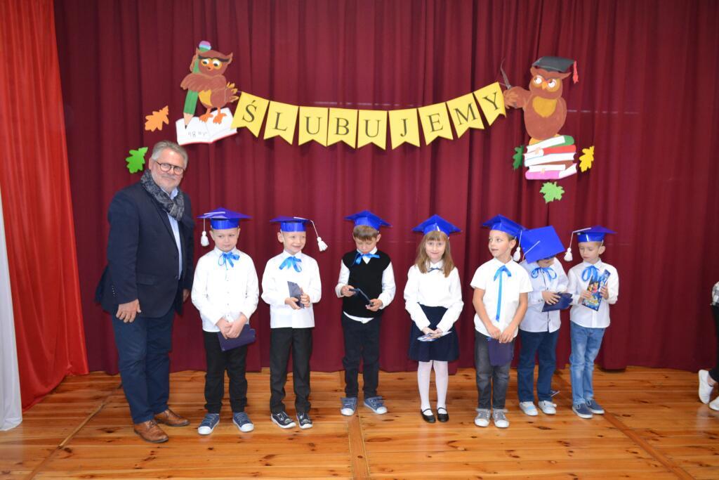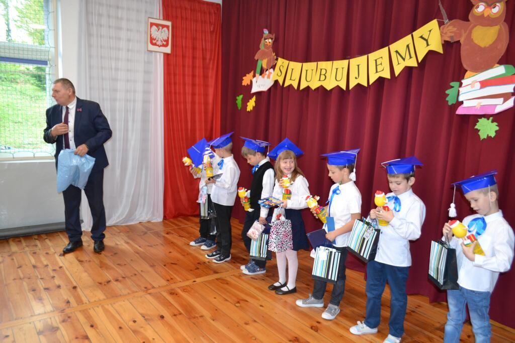 Następnie popłynęły życzenia. Miłe słowa skierowane do pierwszoklasistów popłynęły z ust Pani Dyrektor, p. Wójta, Państwa Radnych, księdza proboszcza oraz Przewodniczącej Rady Rodziców. Na pamiątkę tego wydarzenia dzieci otrzymały dyplomy, słodycze od Rady Rodziców, upominki od rodziców i zaproszonych gości, a następnie zrobiono wspólne pamiątkowe zdjęcia. Po części oficjalnej dalsza część uroczystości przebiegała przy słodkim poczęstunku przygotowanym przez rodziców.