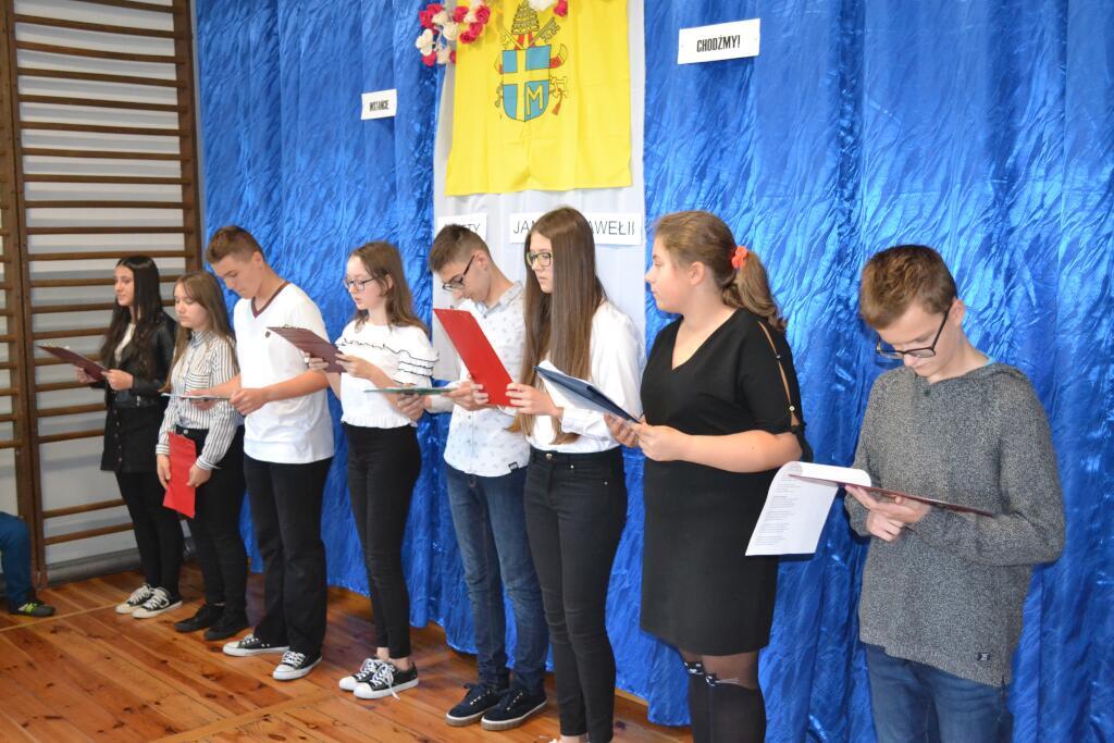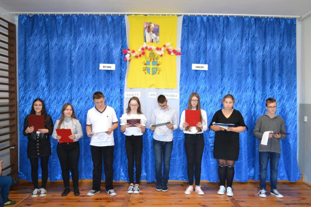 Uroczystość rozpoczęła się montażem słowno-muzycznym pt. „Wielki rodak – Jan Paweł II”, podczas którego przedstawione zostało nauczanie św. Jana Pawła II. Akademię poświęconą życiu i posłudze Jana Pawła II przygotowali uczniowie z klasy VIII pod kierunkiem p. Doroty Bator.