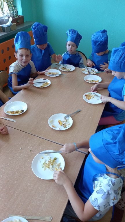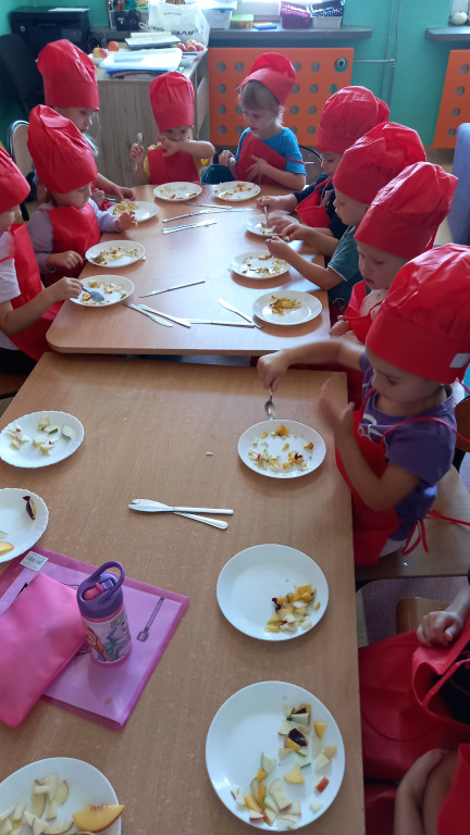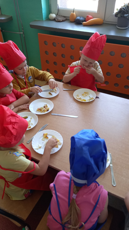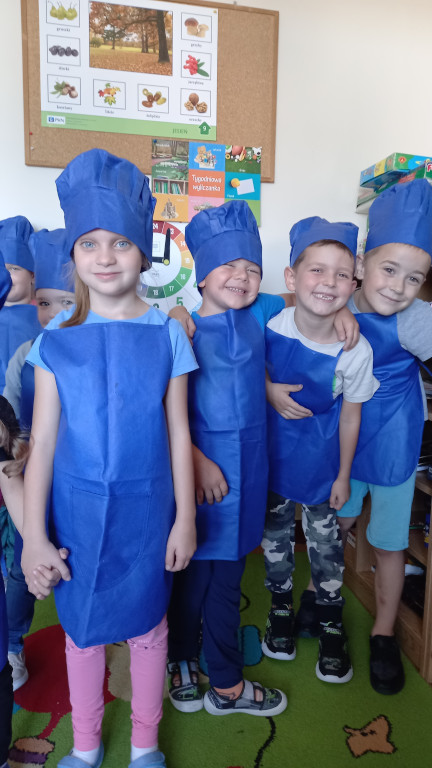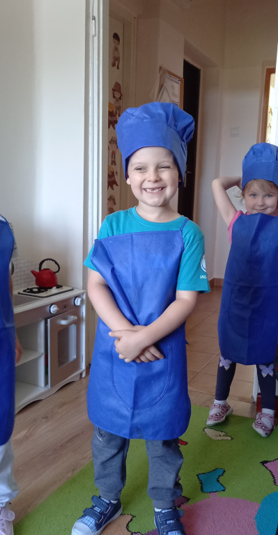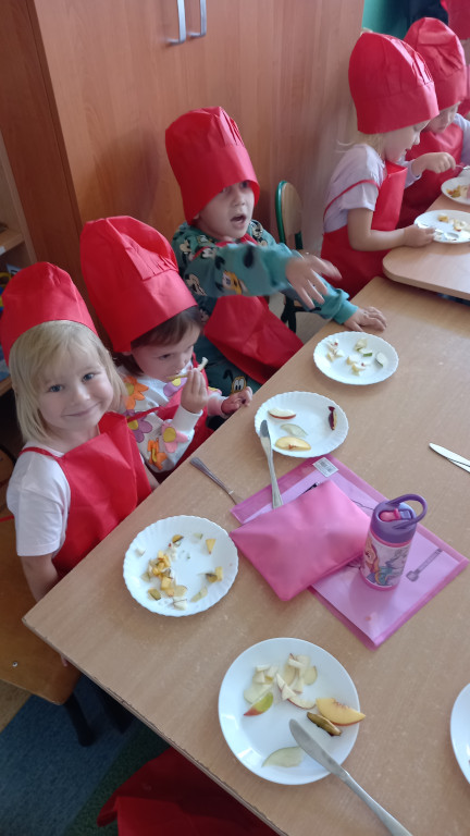 Tradycyjnie jak co roku, już od ładnych kilku lat zmieniamy się w kuchcików. Odpowiednio przygotowani , własnoręcznie kroiliśmy owoce na sałatkę. To trudna sztuka, dla niektórych przedszkolaków , bowiem był to dla nich pierwszy raz kiedy trzymali nóż w rękach.