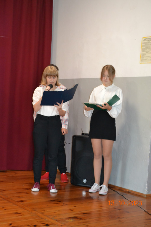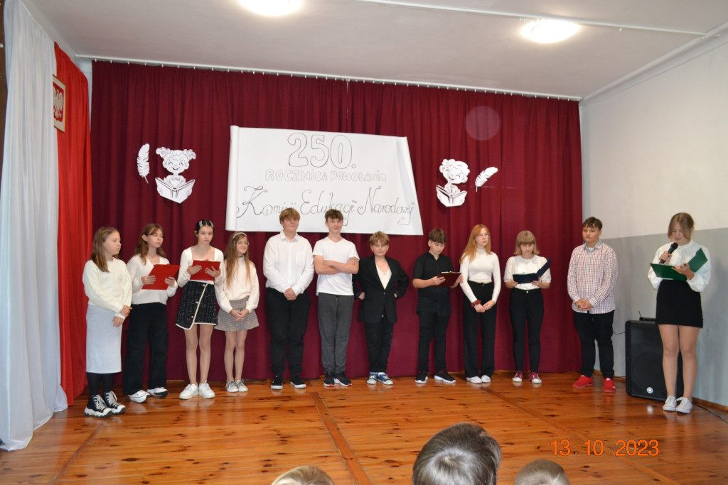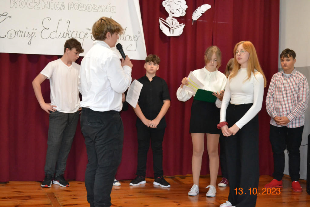 13 października 2023r. w naszej szkole miała miejsce akademia z okazji Dnia Edukacji Narodowej. Na uroczystości zebrała się cała społeczność szkolna. Podczas pięknego występu uczniowie przypomnieli historię Komisji Edukacji Narodowej w dzień jej 250. rocznicy powołania. W humorystyczny sposób przedstawili scenki związane z życiem szkoły oraz wyrazili swoim nauczycielom wdzięczność za codzienną pracę, troskę i poświęcenie. Swoim występem artystycznym dostarczyli obecnym wielu niezapomnianych chwil. Na zakończenie przedstawiciele Samorządu Uczniowskiego przygotowali słodką niespodziankę.