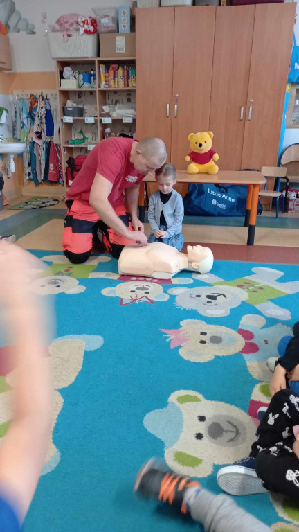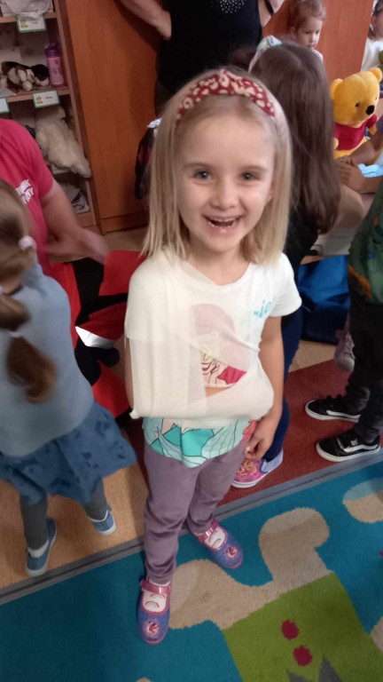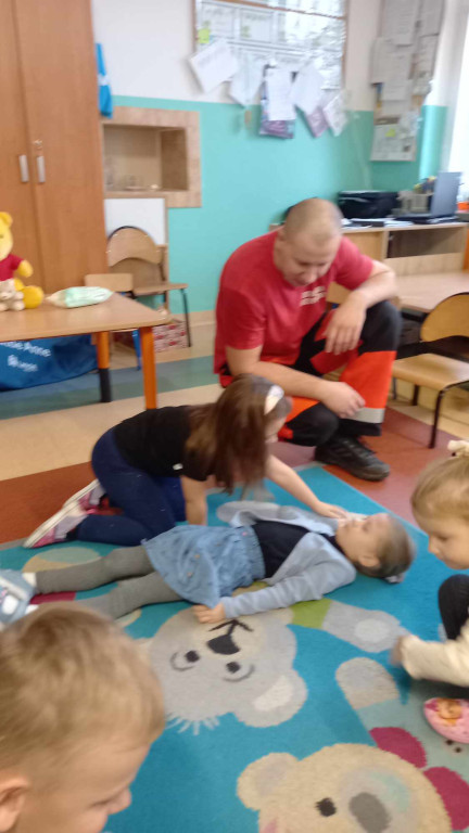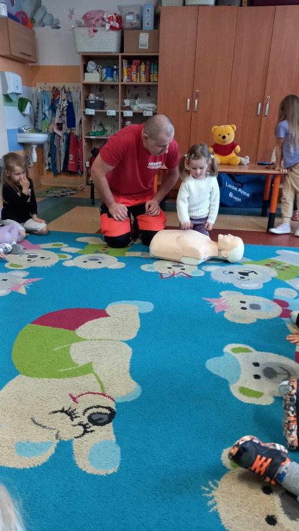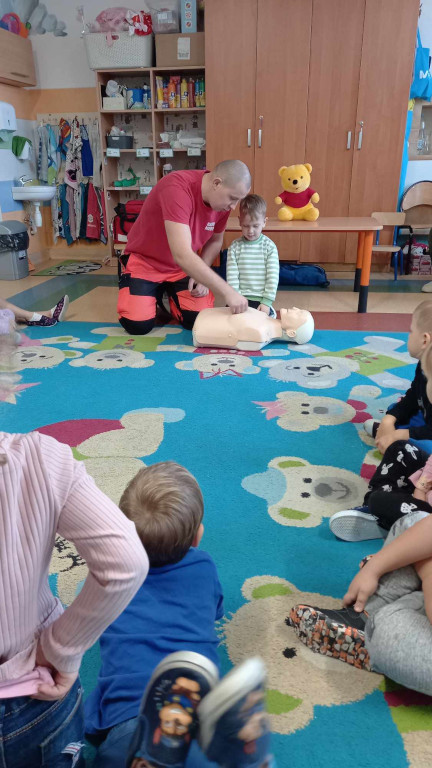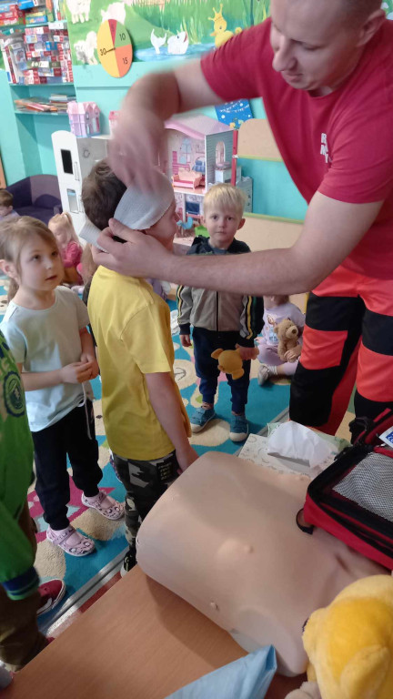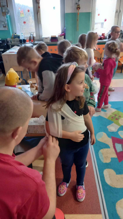 W czwartek, Tata Julki, z grupy Żabki, pan Wojciech ratownik medyczny uczył nas zasad udzielania pierwszej pomocy i ułożenia ciała w bezpieczniej pozycji. Ćwiczenia praktyczne zaliczono małym kursantów na 6. Na koniec był pokaz bandażowania. Mamy nadzieję, że takie warsztaty dadzą efekty w przyszłości.
