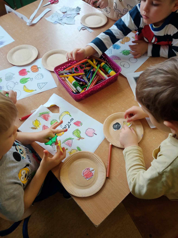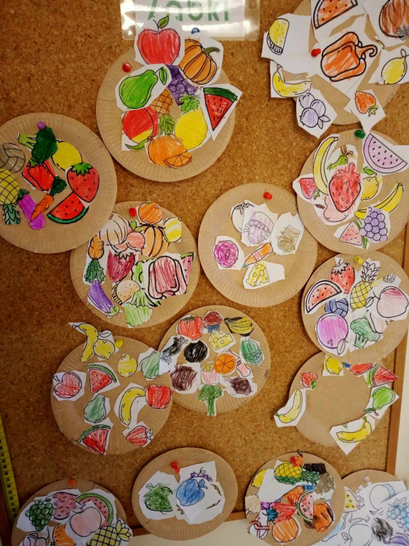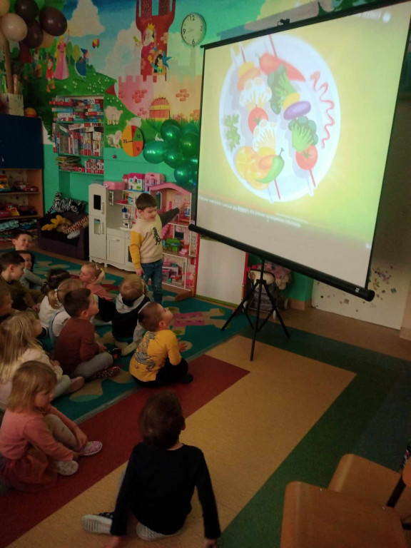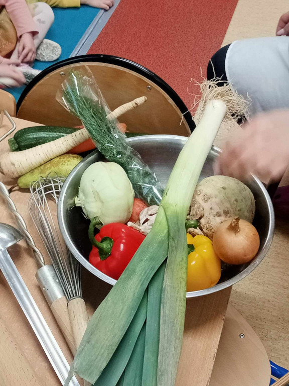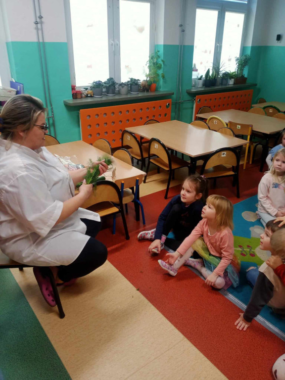 Tydzień zaczęliśmy zdrowym śniadaniem a w środę odwiedziła nas Pani Asia, kucharka, z michą pełną zdrowych warzyw, magicznych urządzeń kuchennych i przypraw. Opowiedziała o tajnikach gotowania pysznych potraw z naszej przedszkolnej kuchni, przedstawiła piramidę zdrowego żywienia oraz ulubione zioła tj. majeranek, kolendra, papryka, bazylia. Okazało się, że wszystkie dorodne warzywa skończą tak, jak w znanym wierszu Jana Brzechwy „Na straganie”, czyli w zupie.