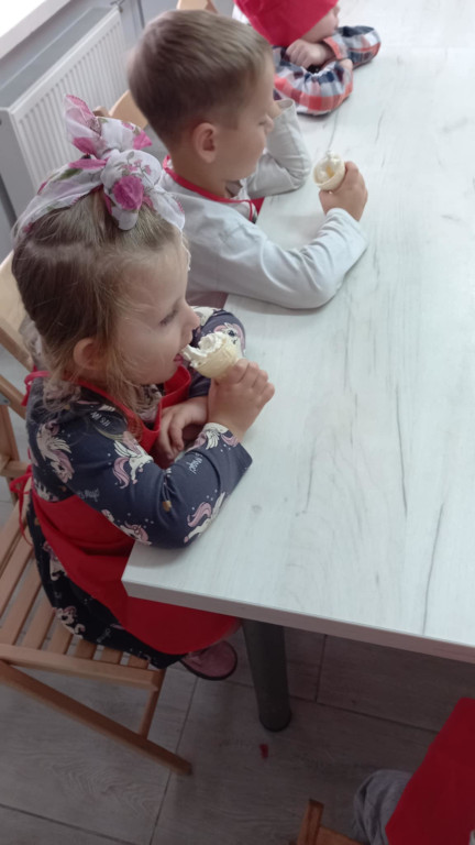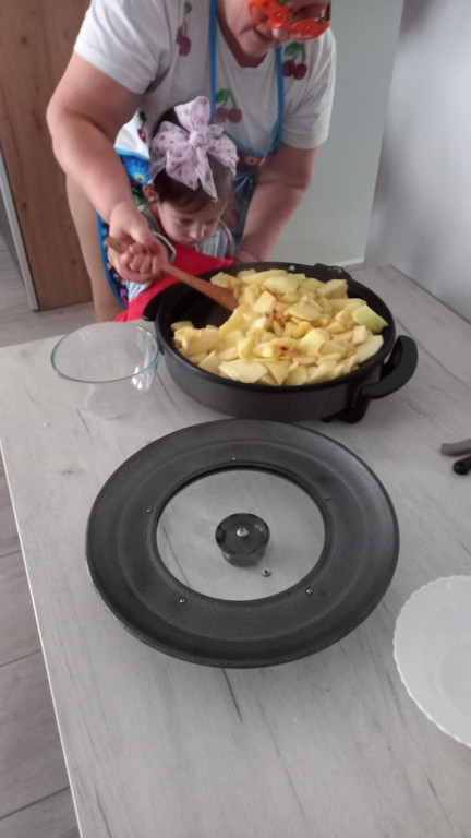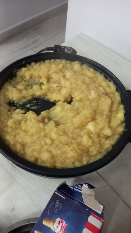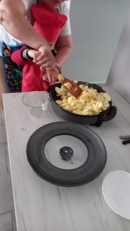 Na jesienne szarugi najlepsze jest wspólne pichcenie i kulinarne eksperymentowanie. Idąc tym tropem, prażyliśmy jabłka z grójeckiego sadu. Jabłeczny mus wykorzystaliśmy do naszych lodów, serwowanych na ciepło, z kleksem bitej śmietany i odrobiny cynamonu. Cóż, pachniało i smakowało obłędnie. Mniam!