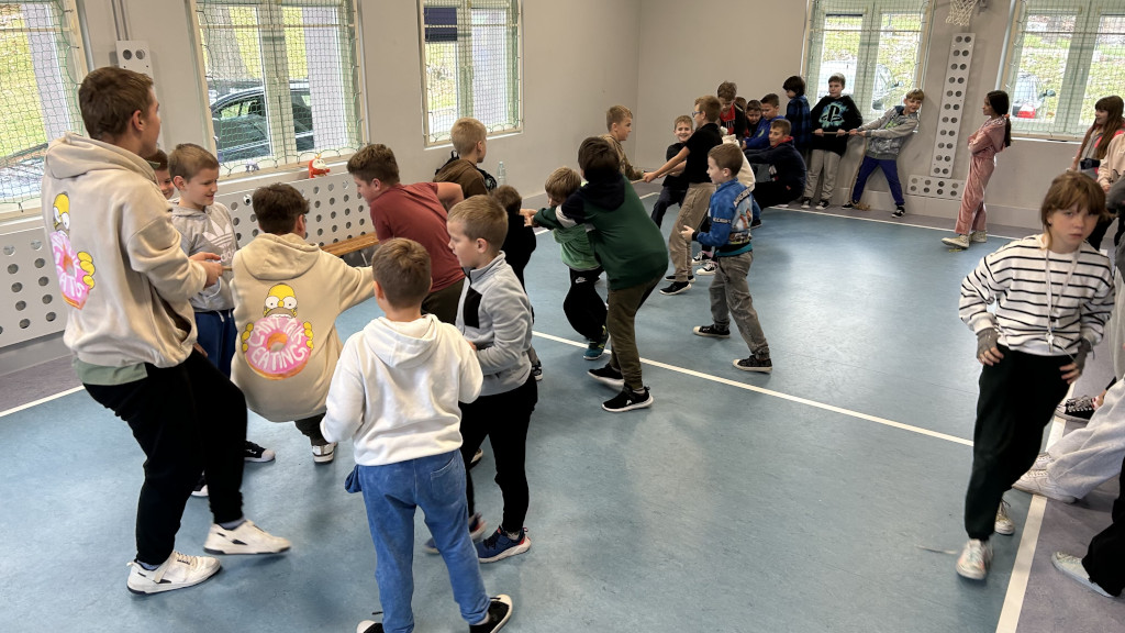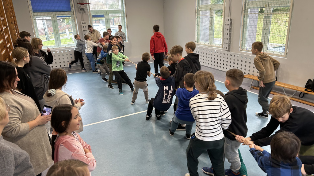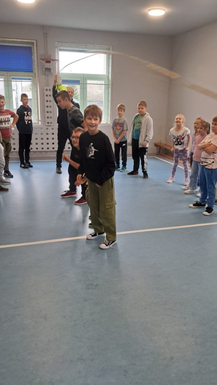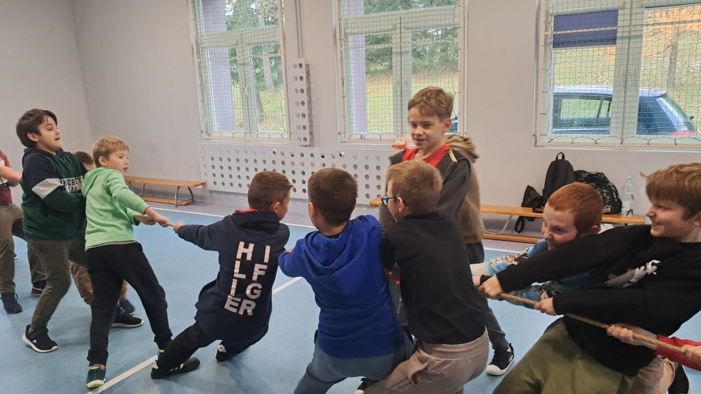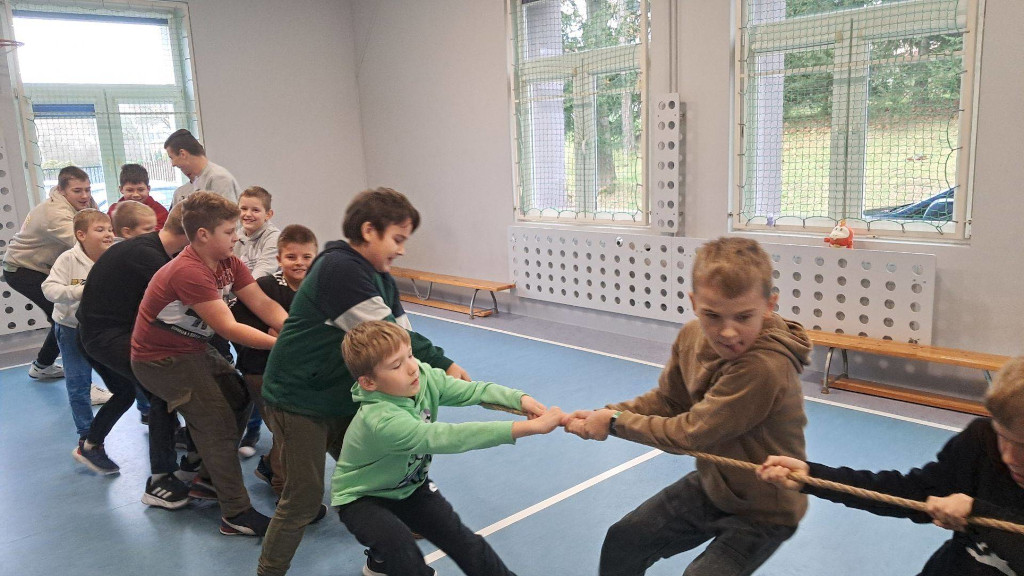 Kontynuując wdrożony w tym roku szkolnym pomysł na zwiększenie aktywności fizycznej w czwartek 21 listopada uczniowie naszej szkoły mieli możliwość aktywnie spędzić przerwy. Tym razem była to próba sił w przeciąganiu liny oraz jedno lub kilkuosobowe skoki przez linę. Odbyły się również tańce, które poprowadziły uczennice klasy ósmej – za co zespół nadzorujący składa podziękowania.