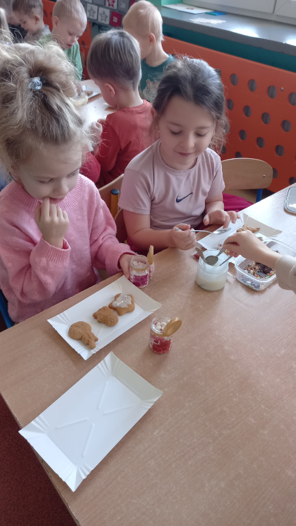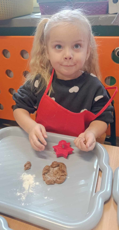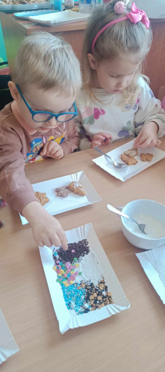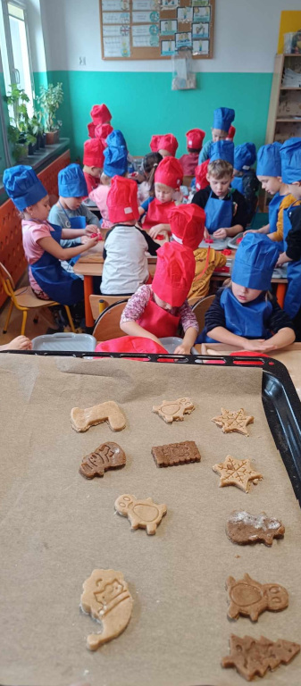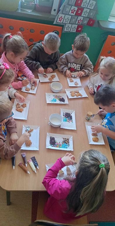Pełną parą ruszyły świąteczne przygotowania w grupie Sówek i Smerfów. Zapach cynamonu, goździków i innych egzotycznych przypraw roznosił się po całym przedszkolu podczas pieczenia pierniczków. Powstało siedem reniferów, zastępy aniołków, cała plejada gwiazdek i wiele innych świątecznych kształtów. Ta tradycja własnoręcznego pieczenia i dekorowania pierniczków towarzyszy nam już od wielu lat.