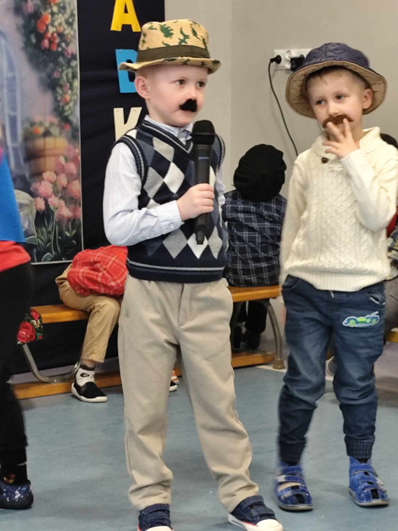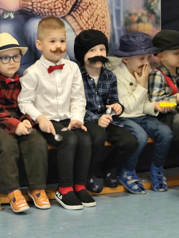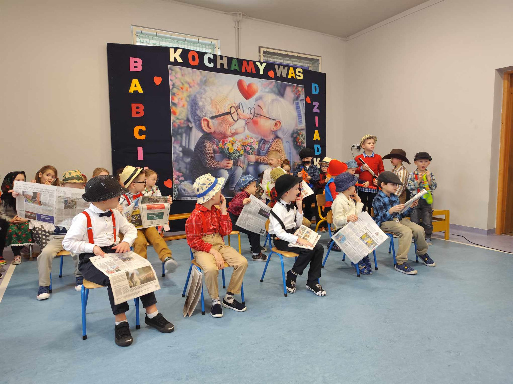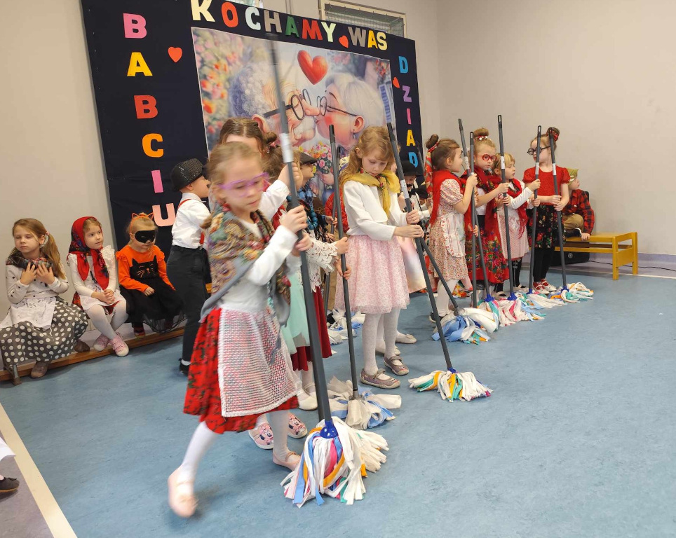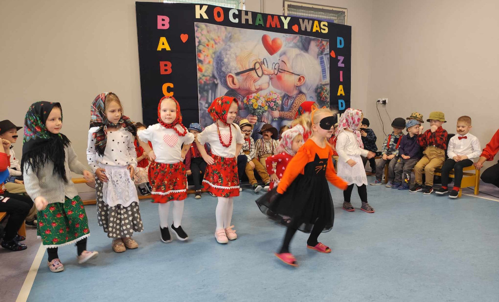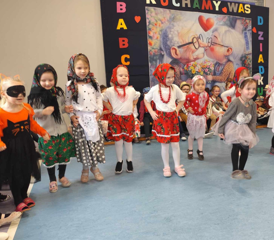 W piątek, sala gimnastyczna pękała w szwach od licznie przybyłych Szanownych Gości. Obowiązywał kolor czerwony. Wnuczki i wnuki przygotowały na to spotkanie, wyjątkowy program artystyczny. Był taniec w kapciach,w kapeluszach. Grała przedszkolna orkiestra pod bacznym okiem dyrygent Basi. Znany ragitme filmowy zagrał zespół- Poparzeni Mlekiem 3. Dla dziadków zaśpiewały z akompaniamentem wszystkie Smerfy. Sówki dla babć zatańczyły z mopami. Na koniec wspólnie odśpiewano piosenkę Poszła babcia na targ… Wszyscy Goście zostali obdarowani słodkimi wypiekami od Rodziców a od wnuków laurkami i koralami.
