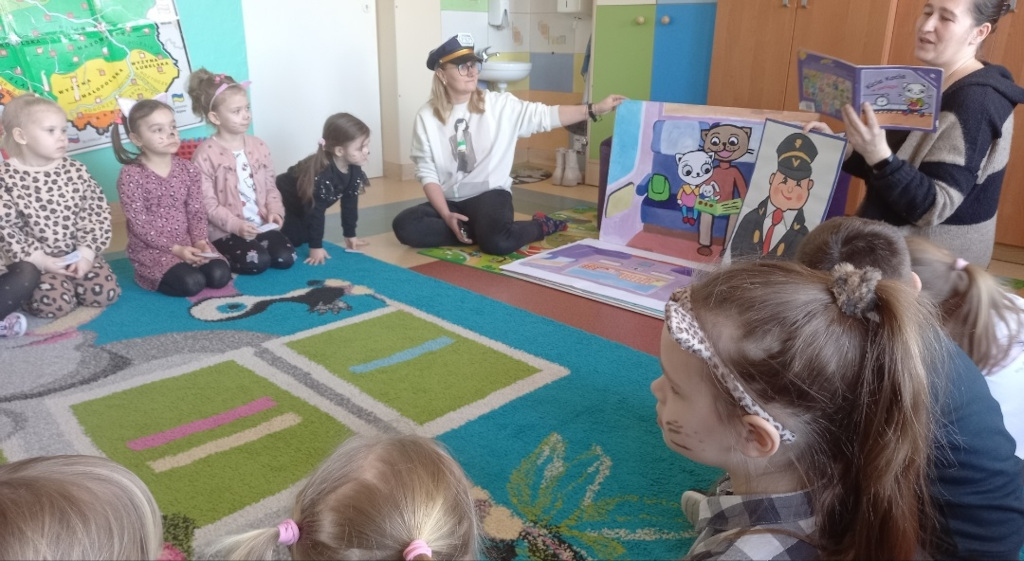 Kicia Kocia i jej tata wybierają się w podróż pociągiem. Kicia Kocia zwiedza dworzec i rozgląda się po peronie. Razem z tatą wsiadają do wagonu i znajdują swoje miejsce w przedziale. W pociągu poznają miłych towarzyszy podróży i uśmiechniętego konduktora. Przedszkolaki podróżowały razem z bohaterką: każdy dostał bilet na pociąg, który został w odpowiednim czasie sprawdzony przez konduktora. Dzieci miały okazję oglądać piękne, duże ilustracje książki. Na koniec zajęć Kicia Kocia przytulała wszystkie dzieci i pozowała do pamiątkowych zdjęć. Nasze przedszkolaki były pięknie wystylizowane: stroje, kocie wąsy, noski. Na koniec zajęć wszyscy skosztowali kocich ciasteczek.