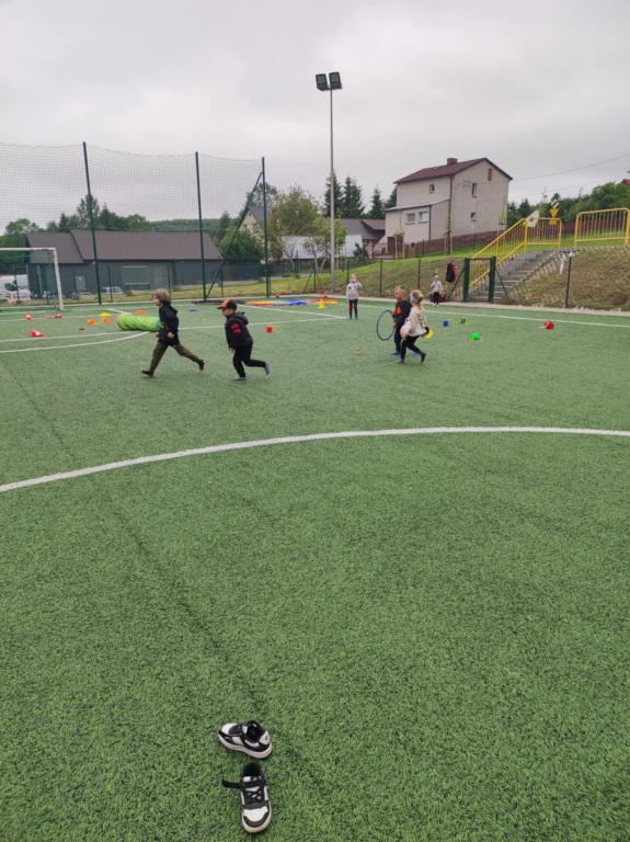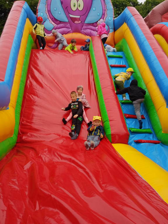 13 -tego w piątek okazał się cudownym dniem szalonych zabaw na świeżym powietrzu. Dwa dmuchańce- ocean i farma były miejscem grupowych, indywidualnych harców. Śmiechu, radości i śmiesznych sytuacji było w bród. Niektórzy pokonywali swoje małe lęki przed wysokością, szybkością a inni wymyślali techniki wspólnego zjazdu. Można było spróbować swoich sił w przeciąganiu liny, przemierzyć boisko na hulajnodze, porzucać ringo, zakręcić hula hop albo pograć w piłkę. Na koniec zabawy dzieci losowały niespodzianki. Były wśród nich karty do gry, figurki, syrenki, kolorowe wiatraczki, potworki itp. podobne gadżety. Aktywny przedszkolak dziś, to być może w przyszłości aktywny dorosły.