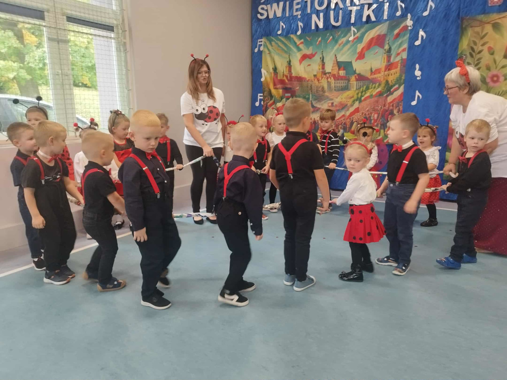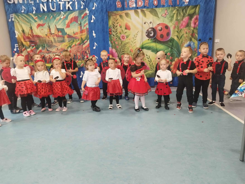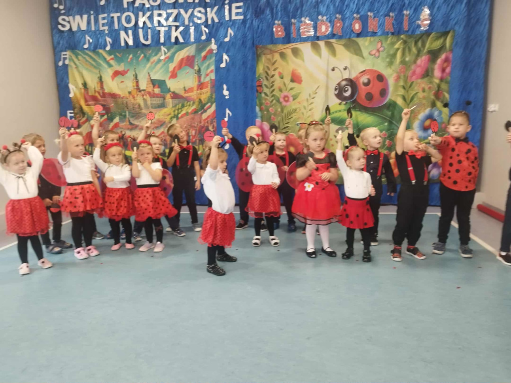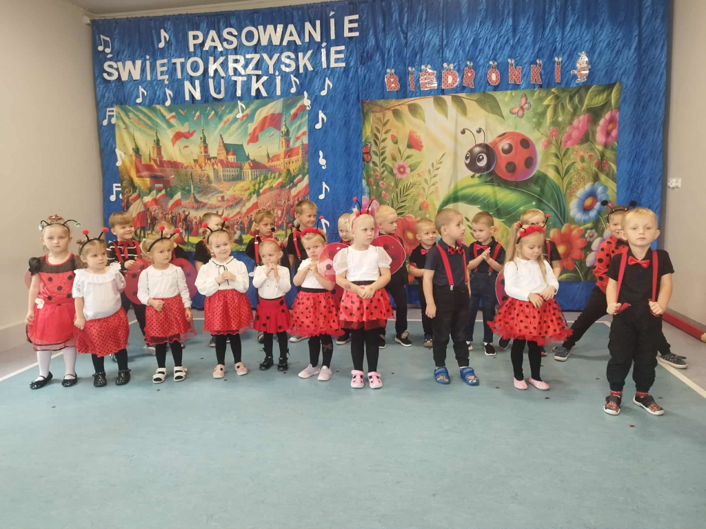 Śpiewały dzieci z najmłodszej grupy podczas uroczystej prezentacji, w czasie której zostały oficjalnie przyjęte w poczet przedszkolaków. Niektóre z nich dopiero zaczynają przedszkolną przygodę. Są ciekawe, radosne i rozbrykane, jak to biedronki. Życzymy Wam dużo miłych wrażeń i wiele frajdy ze wspólnego odkrywania świata.