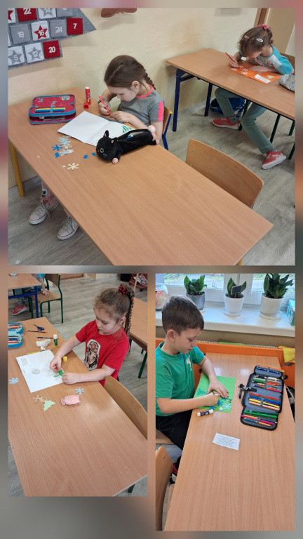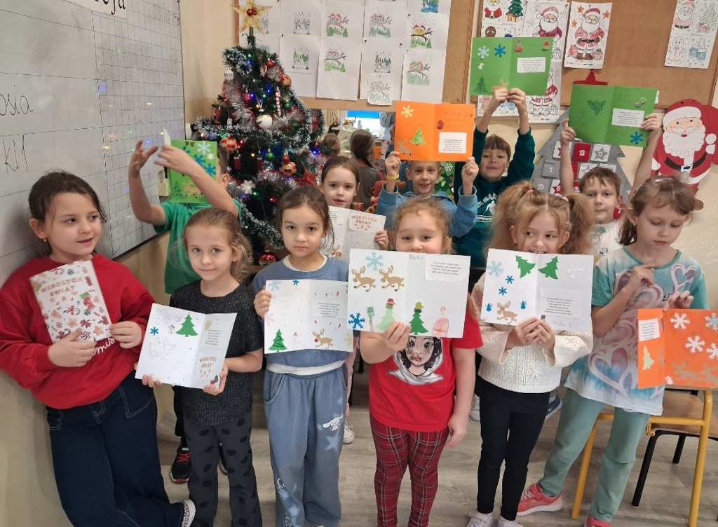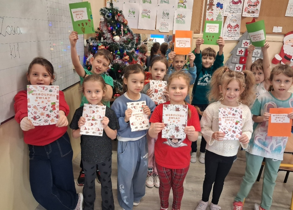 Uczniowie klasy pierwszej przygotowali kolorowe, pełne życzliwości kartki świąteczne dla dzieci chorych, przebywających w szpitalu. Każda kartka została wykonana własnoręcznie i ozdobiona z wielką starannością.