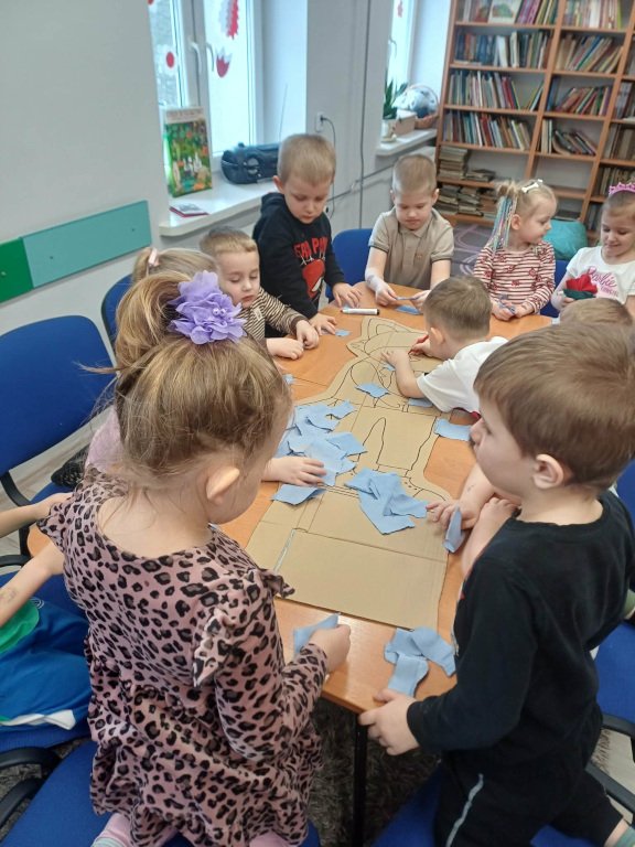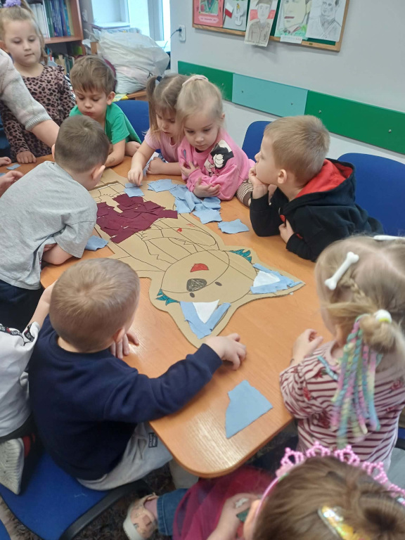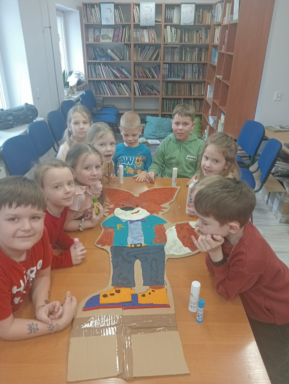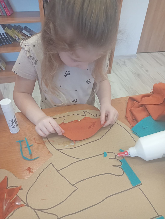 W drugiej części zajęć odbyła się praca plastyczna. Dzieci wyklejały dużą postać Fenka i Maksa,  wykorzystując różnorodne materiały tekstylne (tkaniny, filc, włóczkę). Zadanie rozwijało sprawność manualną, wyobraźnię oraz umiejętność współpracy w grupie – dzieci wspólnie dzieliły się materiałami i pomagały sobie nawzajem.