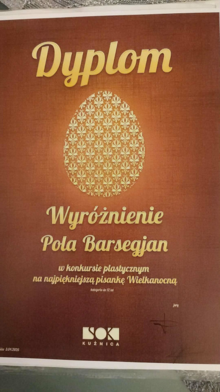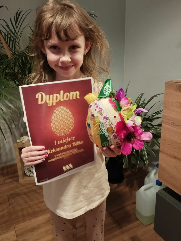 Z radością informujemy, że Aleksandra Biłko zdobyła I miejsce, zachwycając jury swoją pomysłowością i starannością wykonania pracy. Wyróżnienie otrzymała również Pola Barsegjan , której pisanka została doceniona za kreatywność i estetykę.